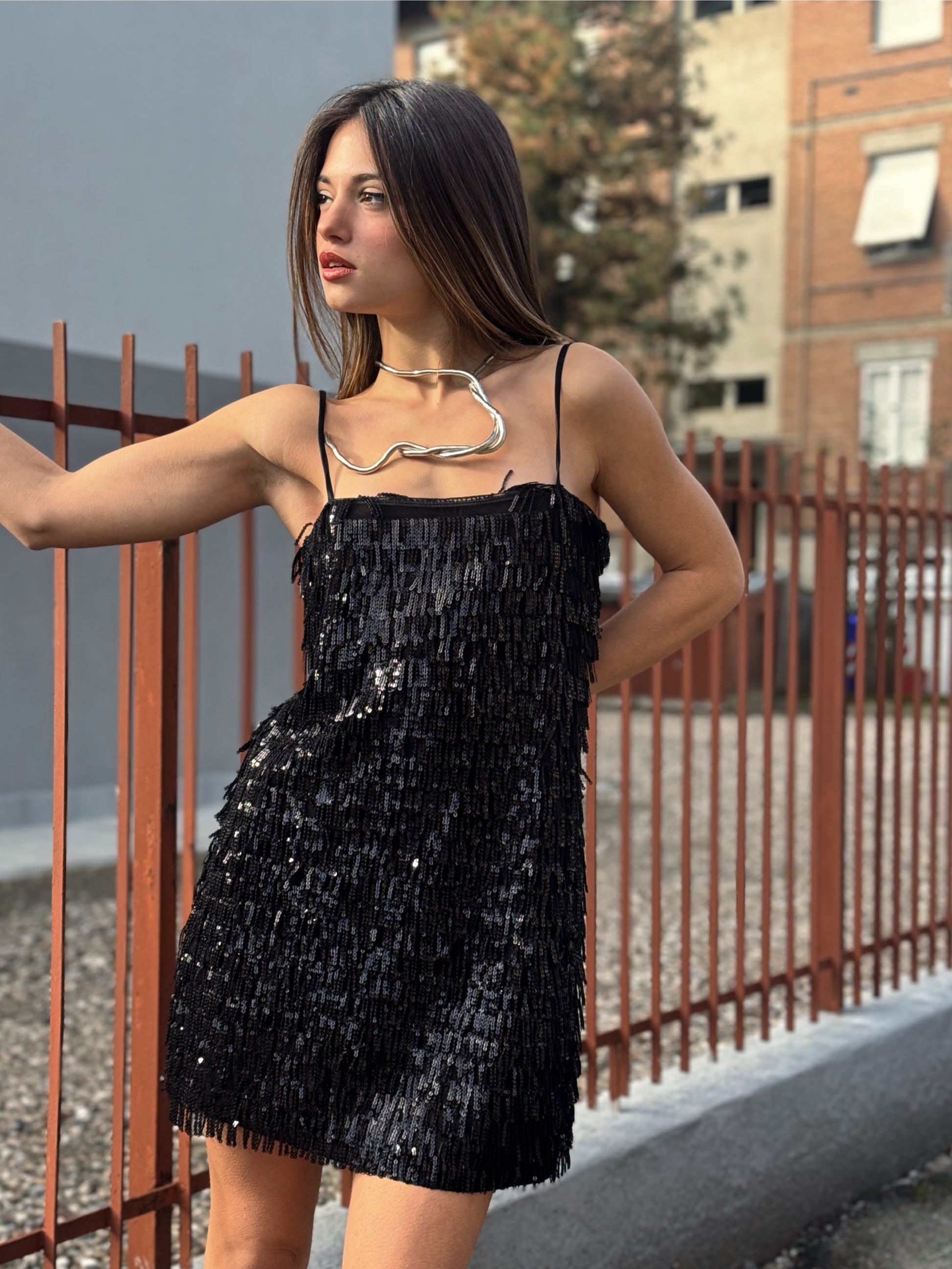 Abito corto caratterizzato da una cascata di frange meravigliosa! Vestibilità regolare.