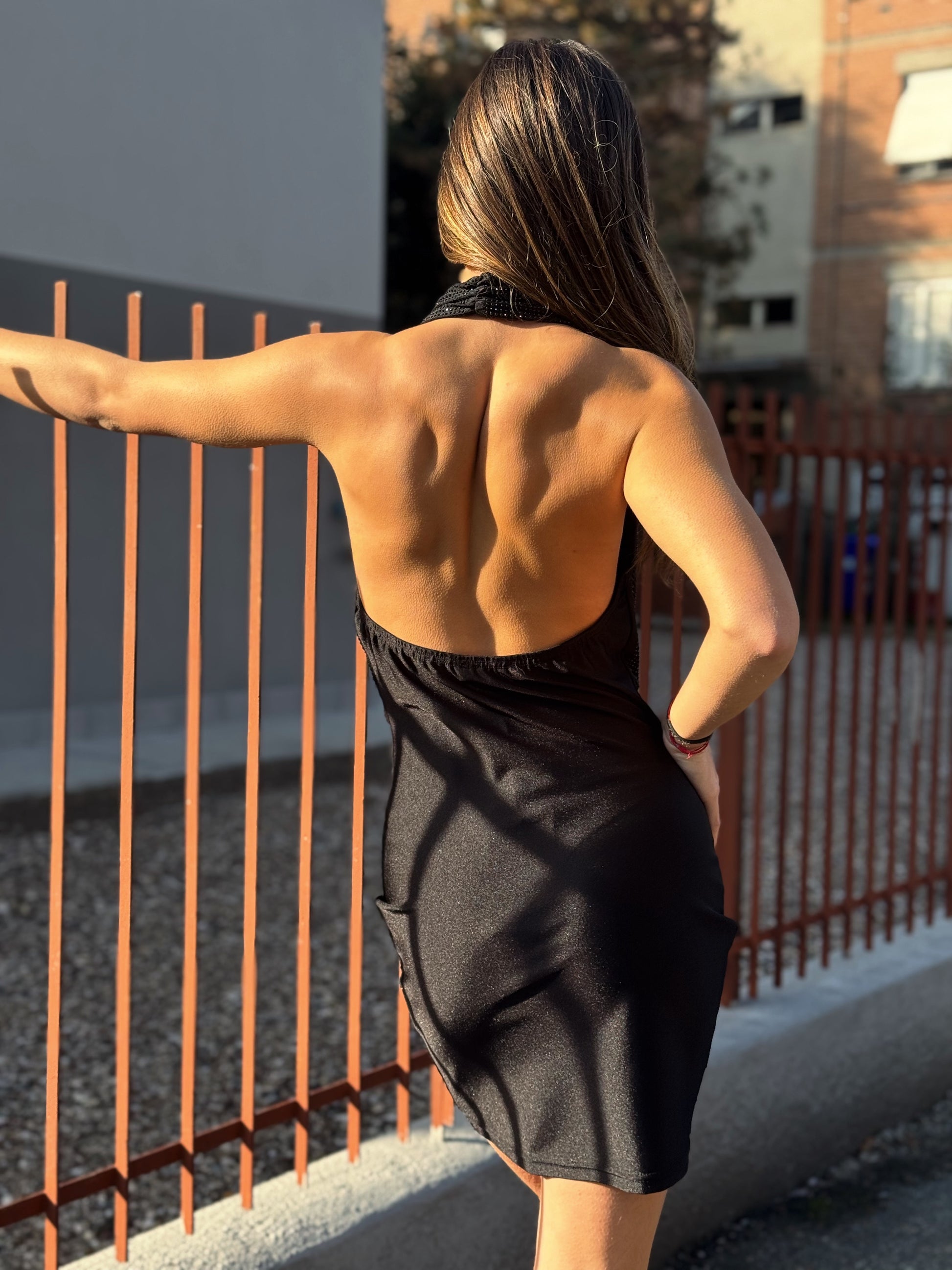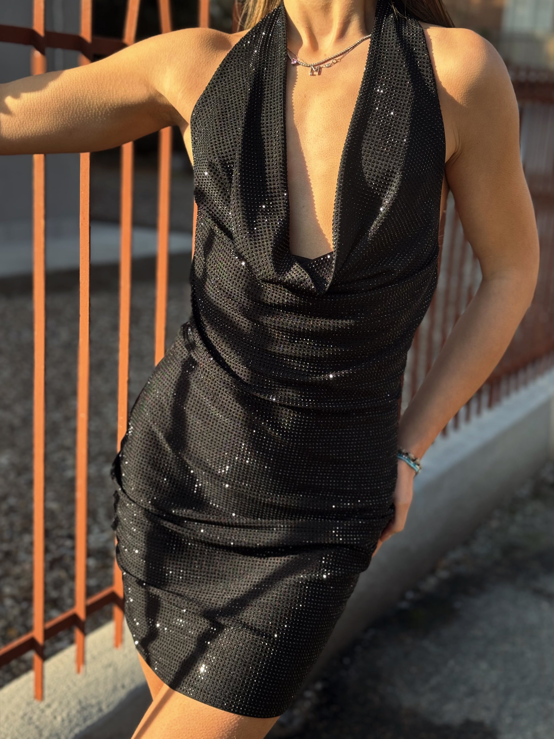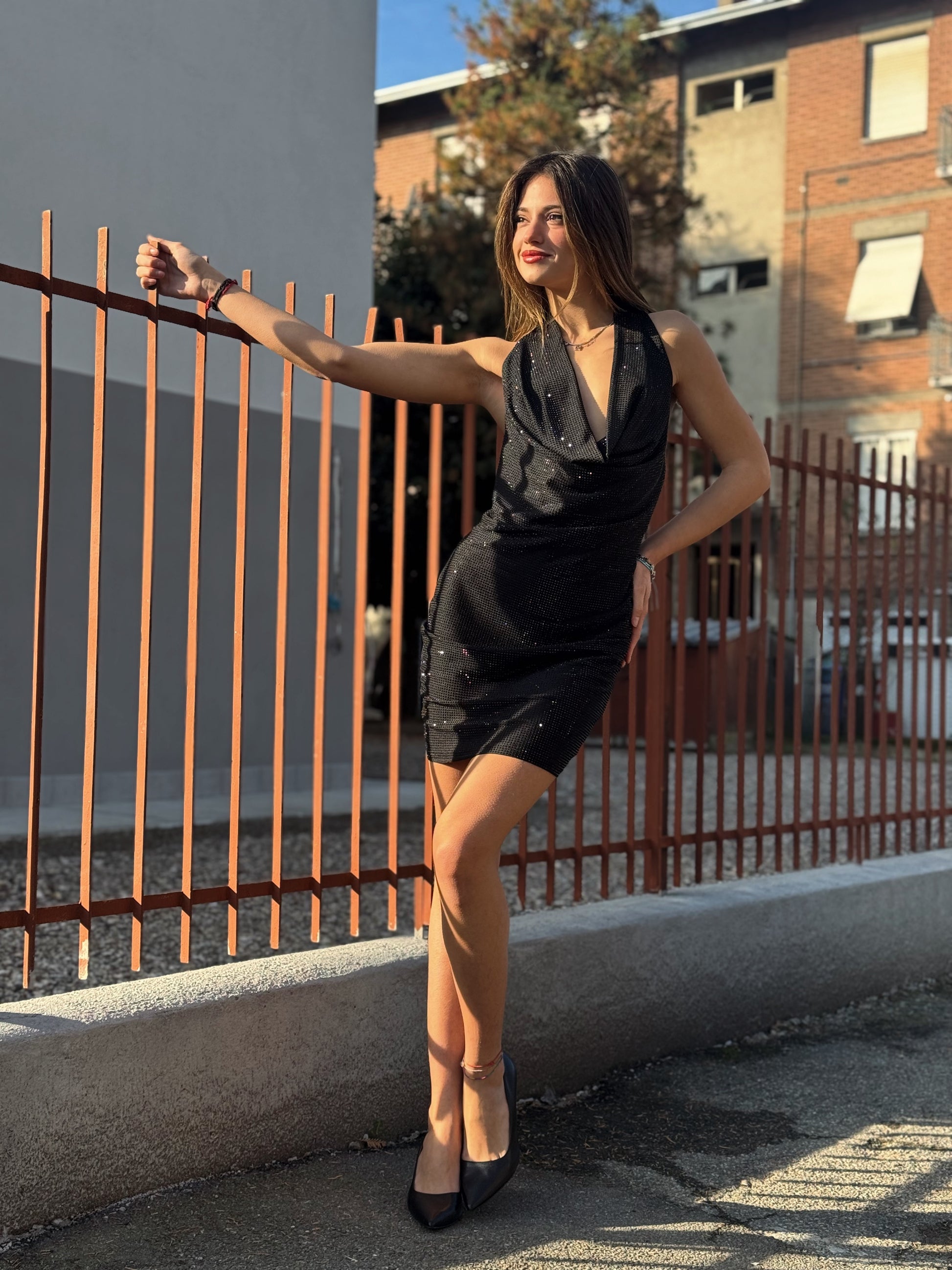 Abito interamente ricoperto di strass, con un bellissimo scollo a gronda sul davanti, e ovviamente anche dietro dove la schiena viene lasciata scoperta. È elasticizzato e comodo, inoltre come lunghezza arriva appena sotto la metà coscia.