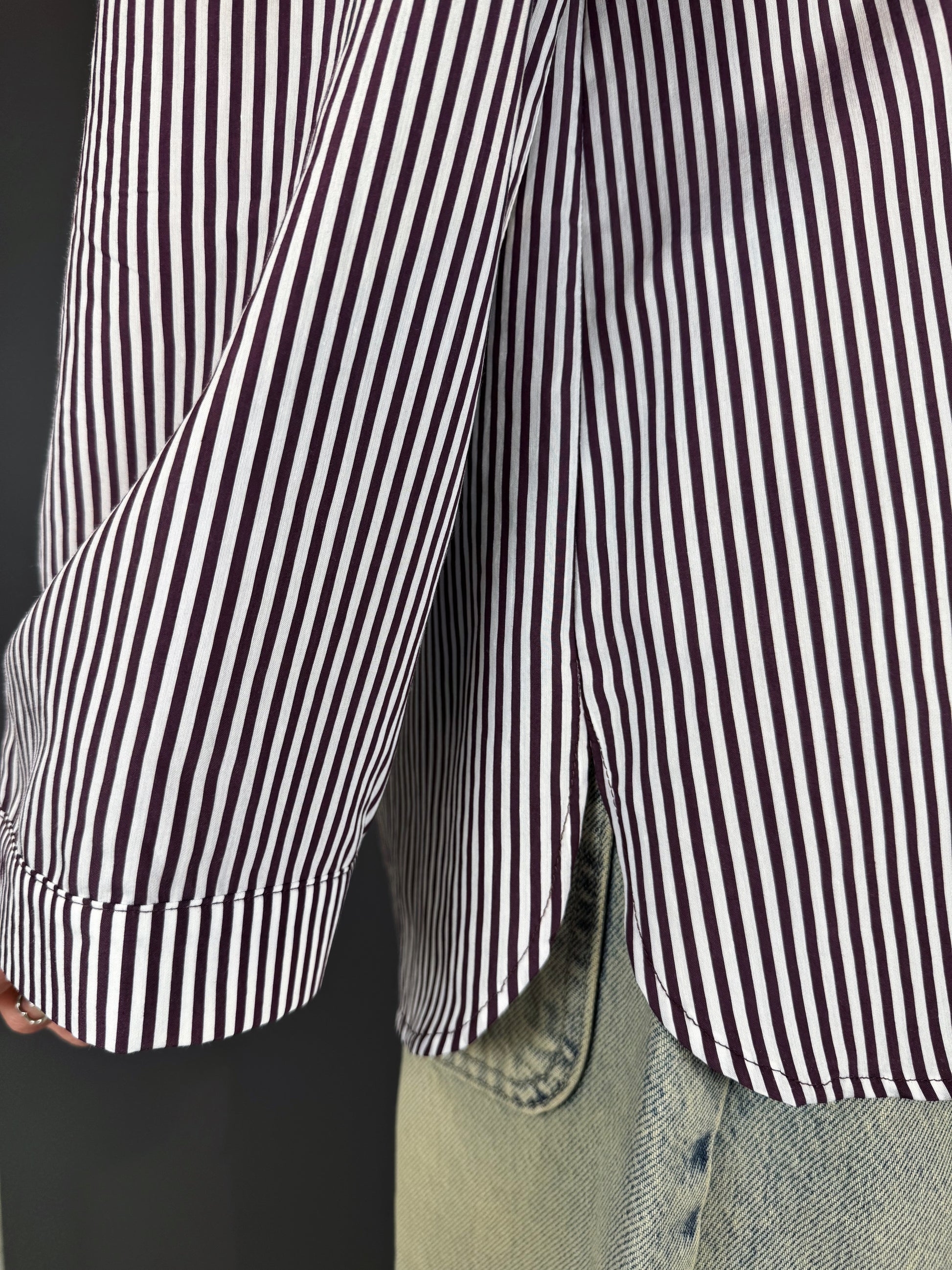 Dettagli di Design: Colletto a punta classico e taschino applicato sul petto, polsini strutturati con chiusura a bottone e chiusura frontale con bottoni a contrasto.
