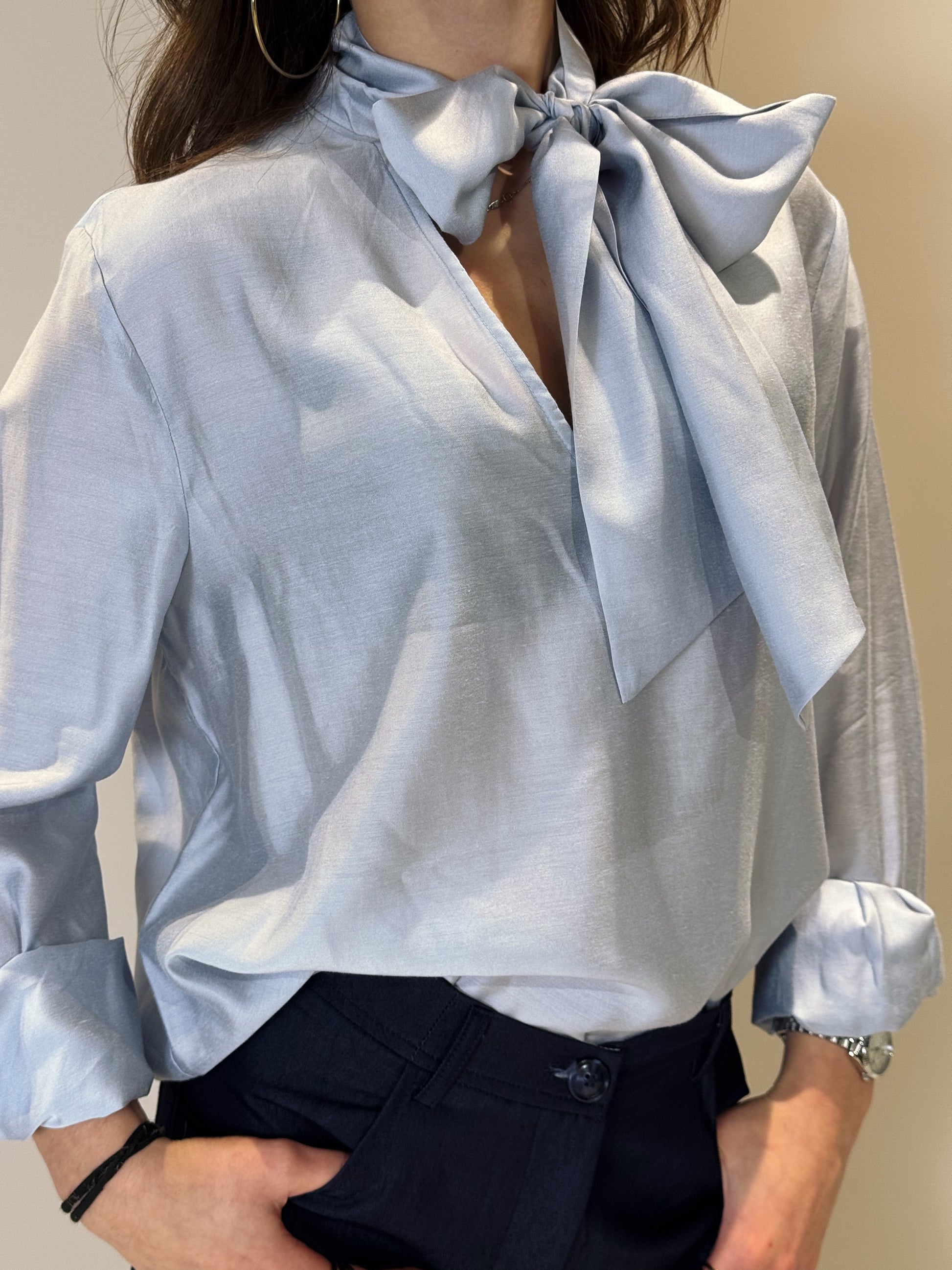 Scollo a V con Fiocco: Il design presenta un elegante scollo a V sormontato da ampi nastri coordinati. Puoi annodarli in un romantico fiocco o lasciarli sciolti tipo cravatta.