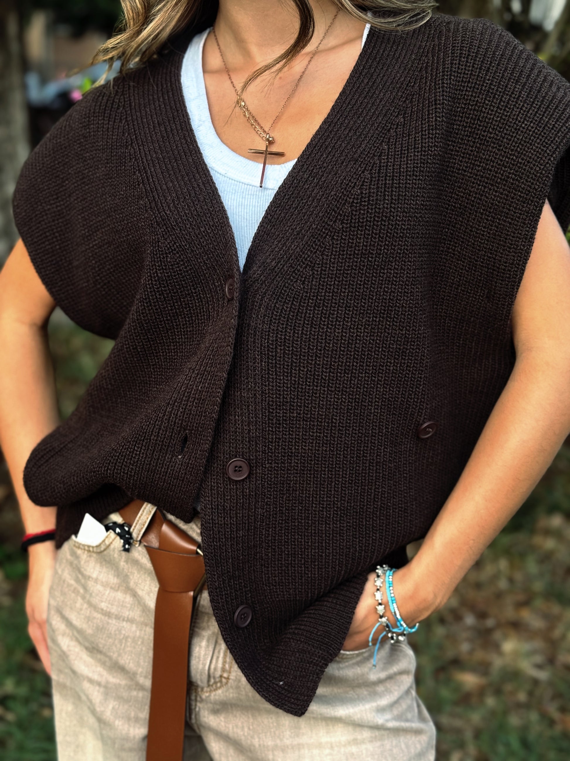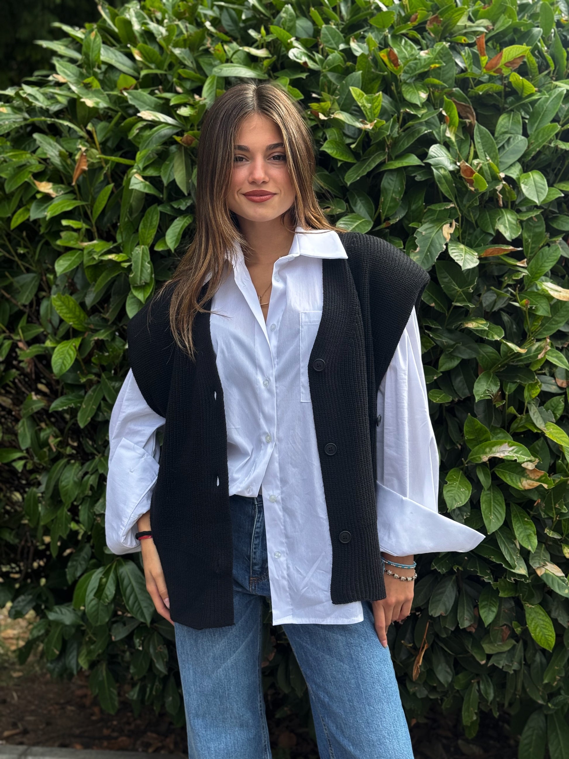 Aggiungi un tocco di raffinatezza al tuo guardaroba con il nostro gilet in maglia. Questo capo, dal design incrociato con chiusura a bottoni, è la scelta perfetta per creare look a strati dinamici e sofisticati. Realizzato in un morbido filato, si adatta splendidamente sopra una camicia, una t-shirt a maniche lunghe o anche un abito. La sua texture lavorata a coste verticali aggiunge profondità e carattere, rendendolo un pezzo essenziale per ogni stagione.
