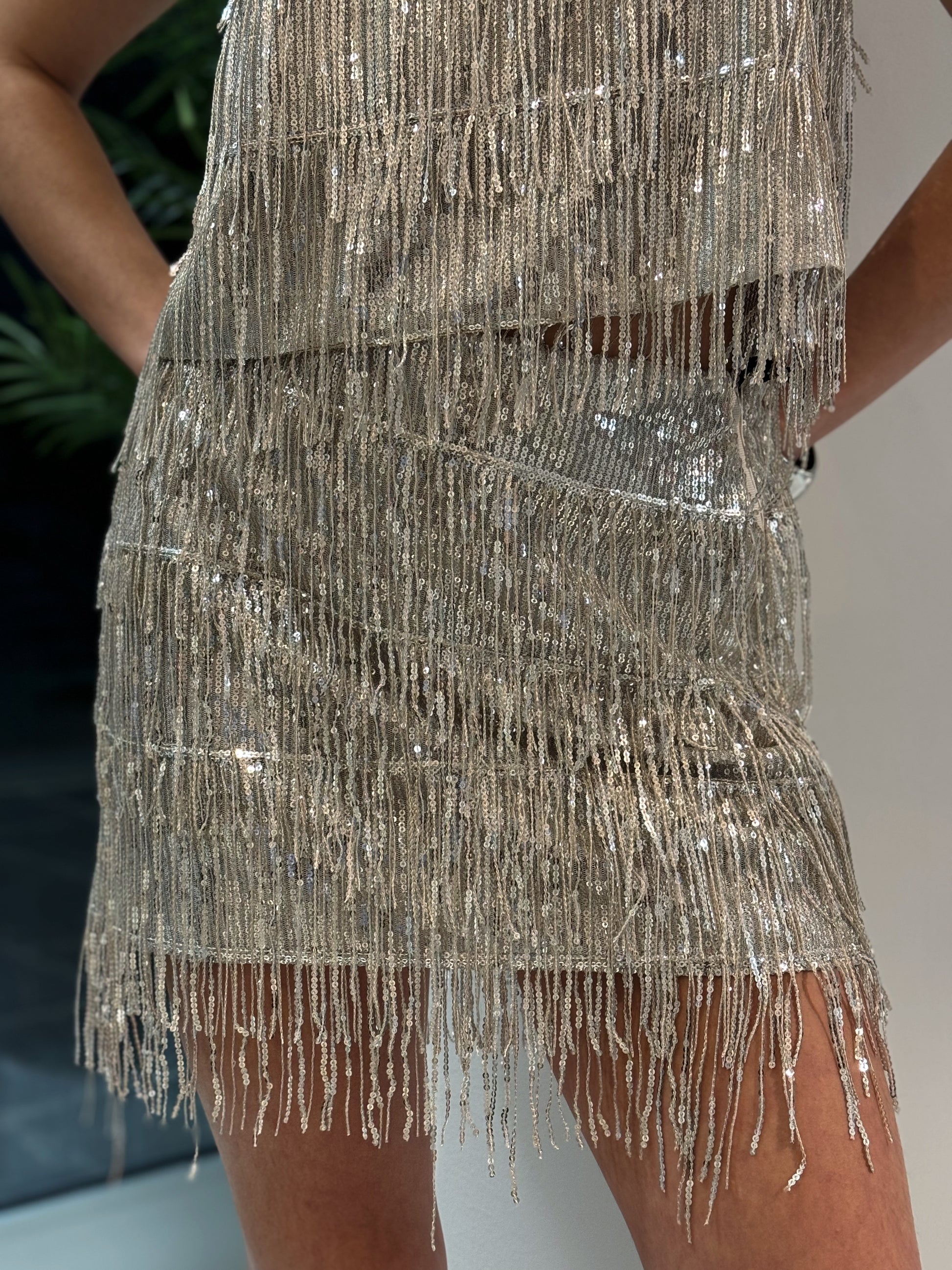 Gonna con una delicatissima cascata di micro paillettes. Ha una chiusura laterale tramite zip ed elastico in vita. È un modello elasticizzato e molto comodo. La vestibilità è regolare.