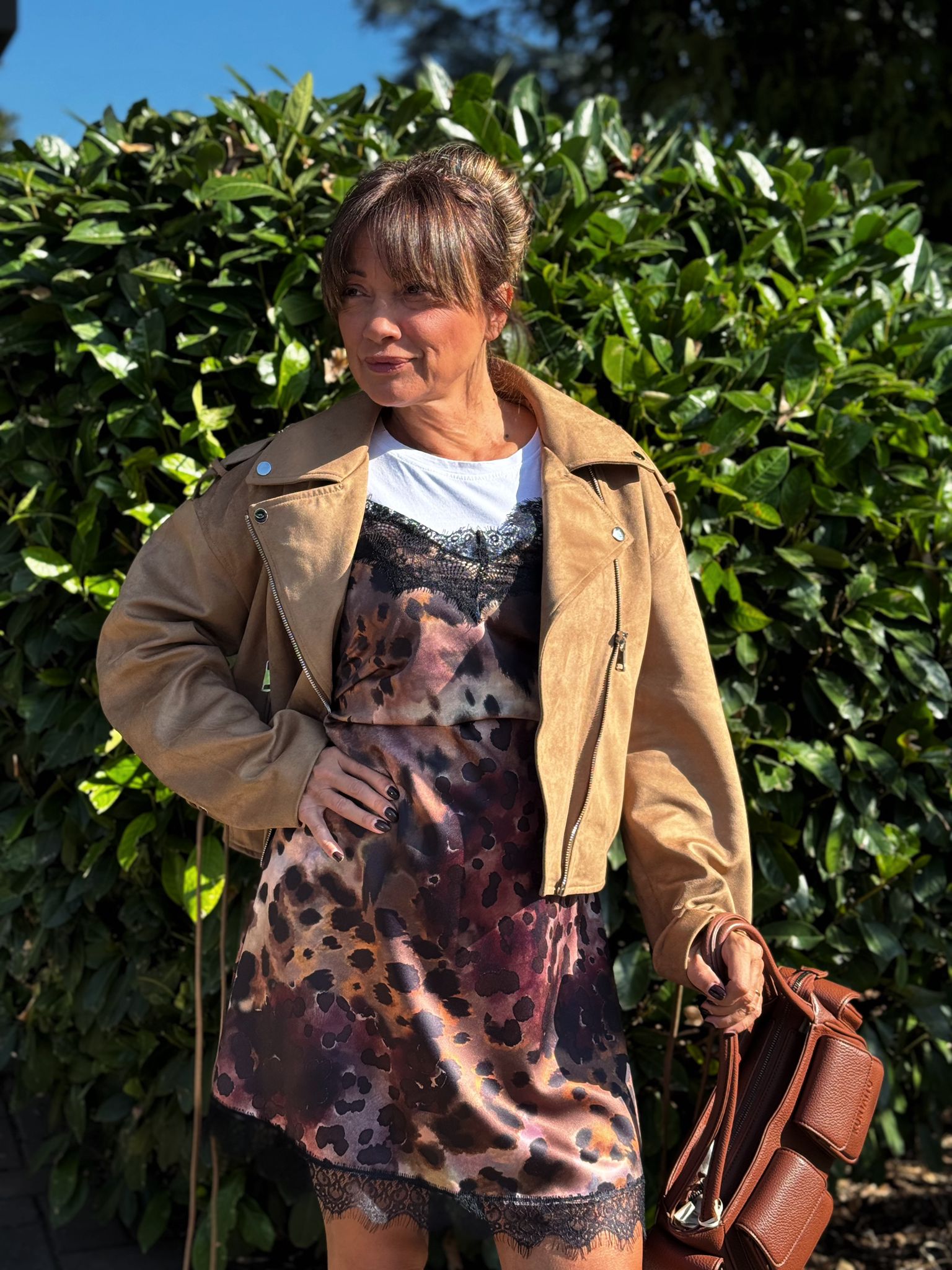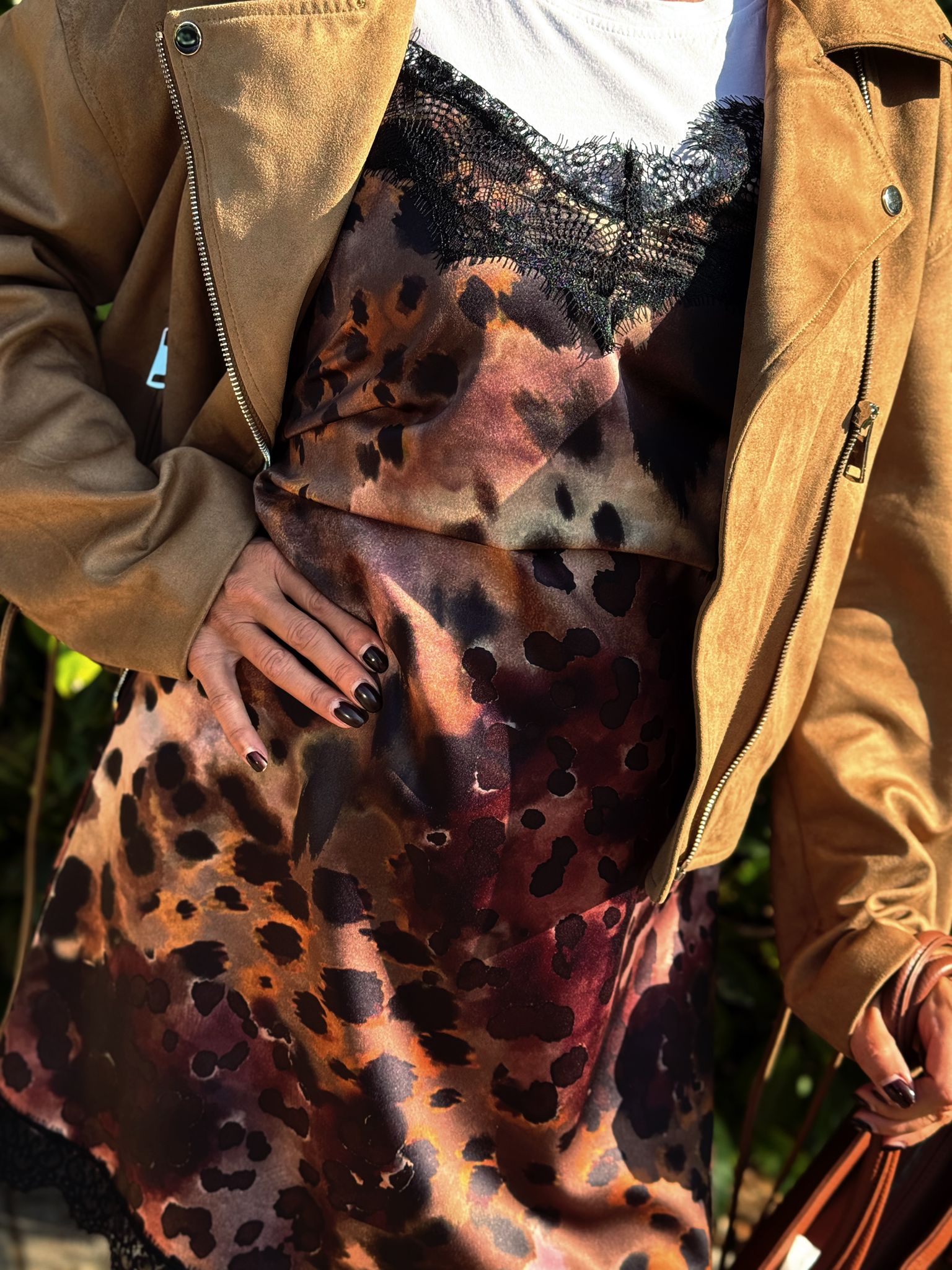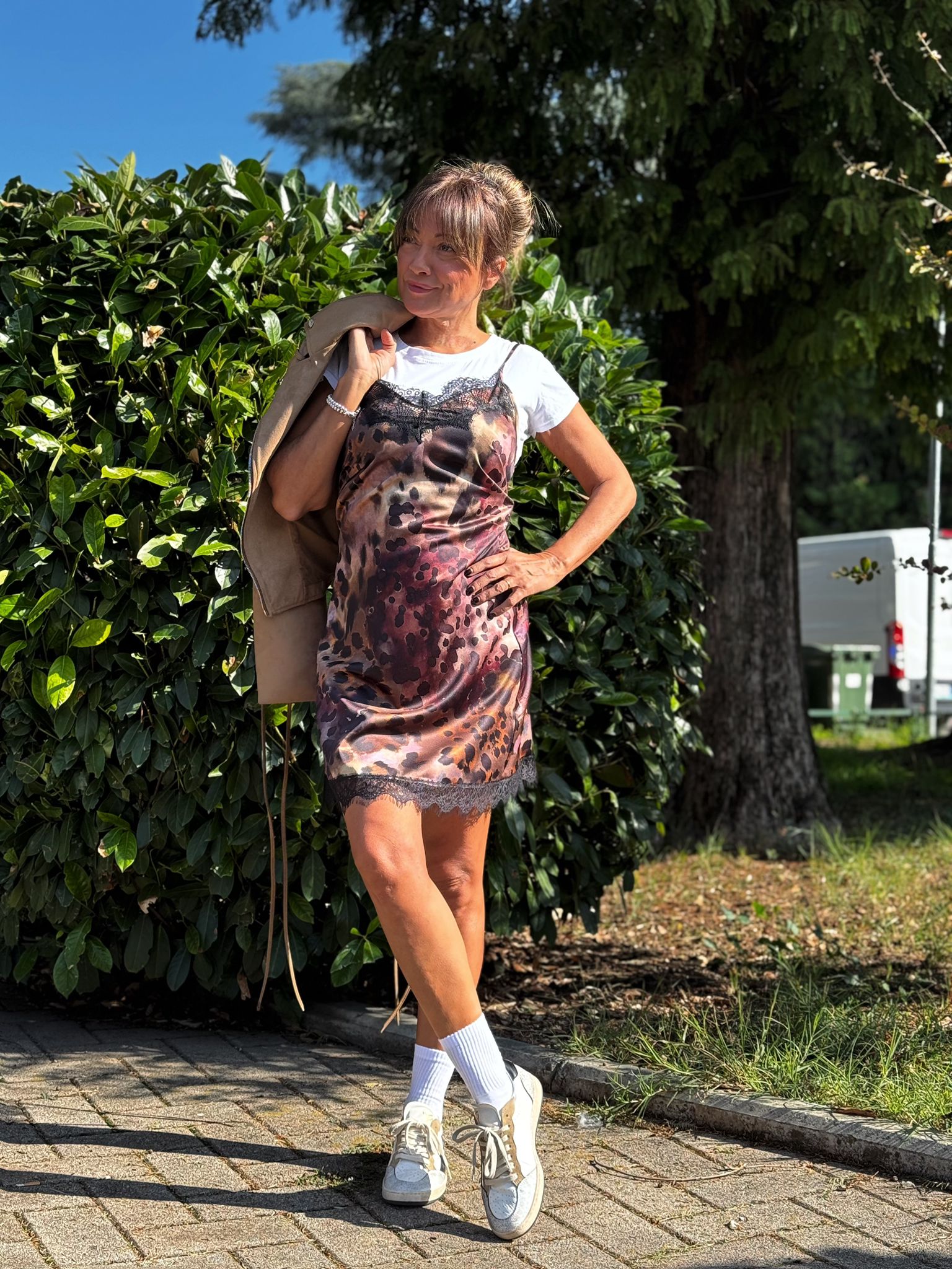 Abito sottoveste con bordi in pizzo. Ha una fantastica fantasia maculata che alterna i toni del moro e del bordeaux.