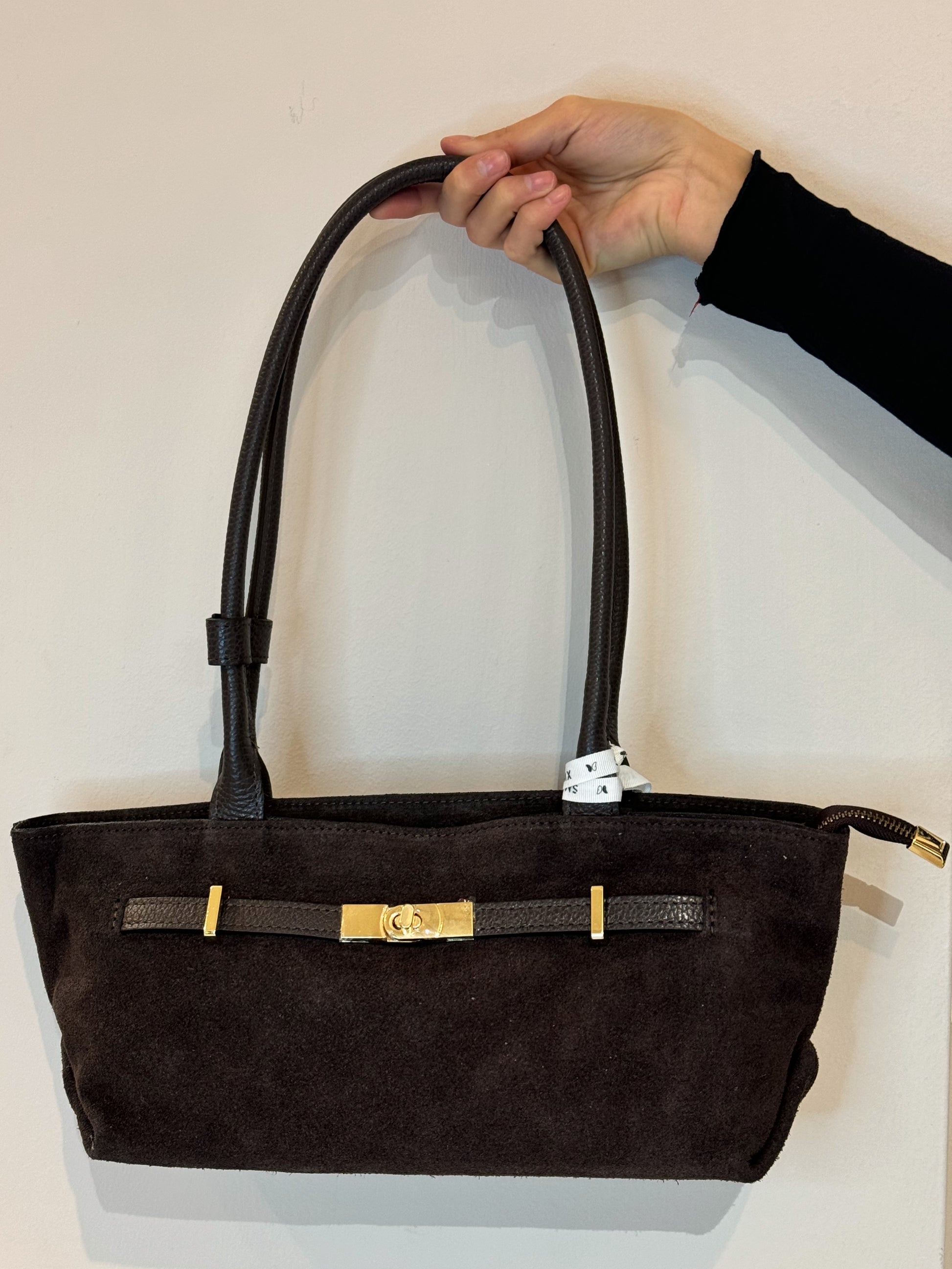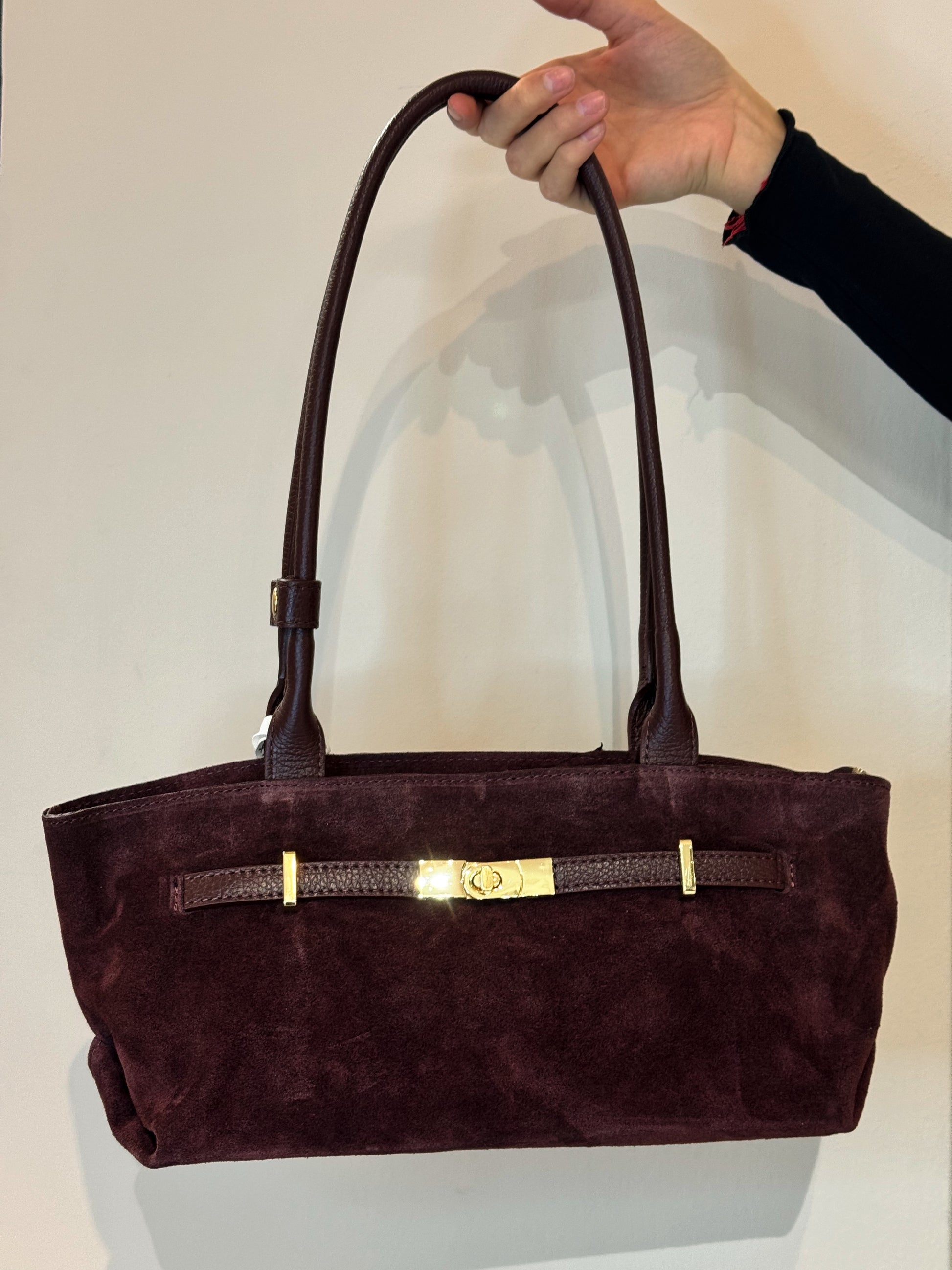 Borsa scamosciata dal modello a baguette, con manico ampio e un dettaglio gioiello meraviglioso applicato sul davanti. Borsa super comoda e abbastanza capiente, inoltre il manico ampio è super pratico e funzionale perché ci permette di portare la borsa a spalla anche con giacche o maglioni più over e spessi!