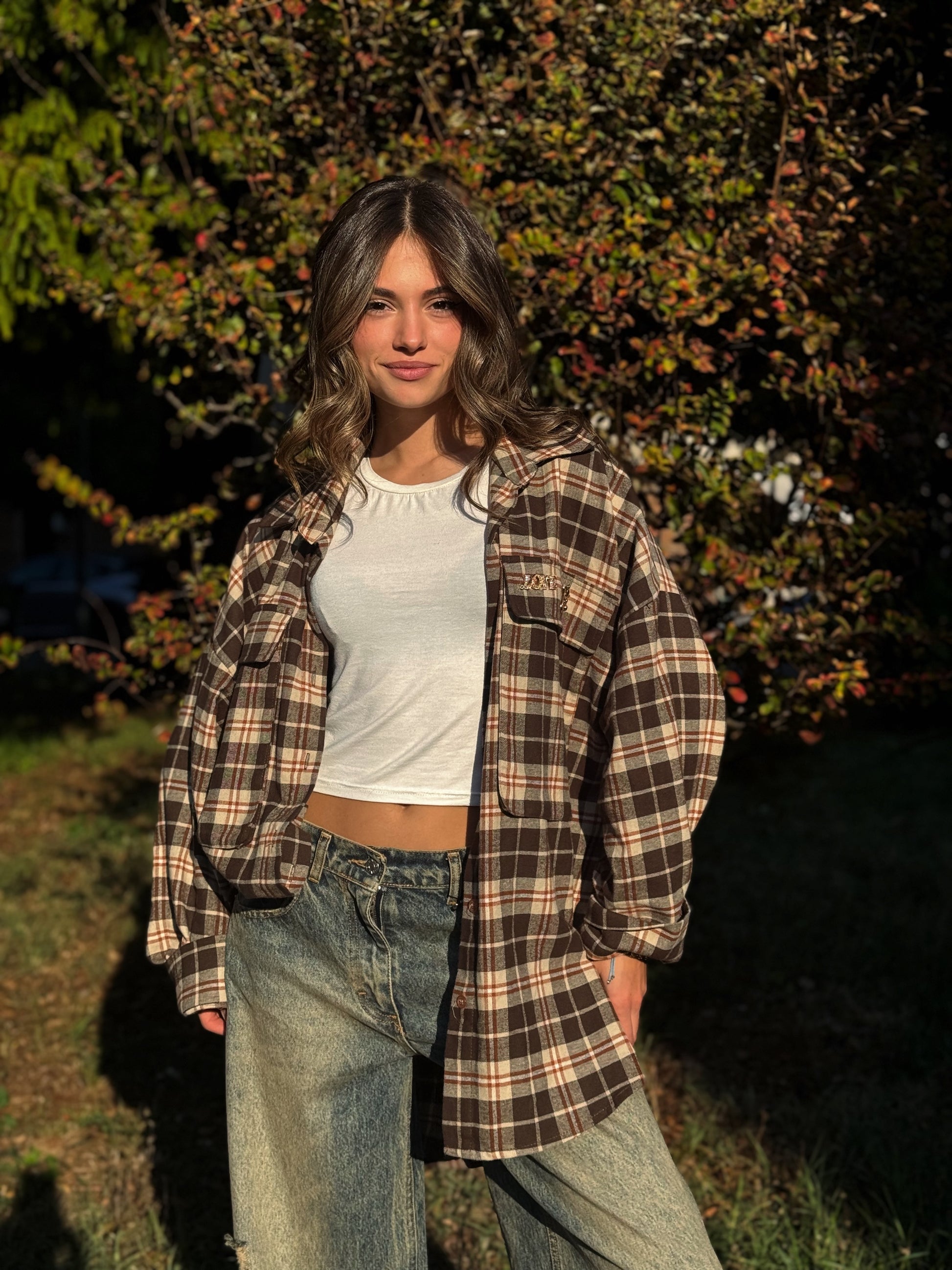Camicia over stampa check, dalla linea molto morbida con dei colori che alternano i toni del moro e del beige. Inoltre ha delle carinissime spille sul taschino destro. Taglia unica con una vestibilità perfetta!