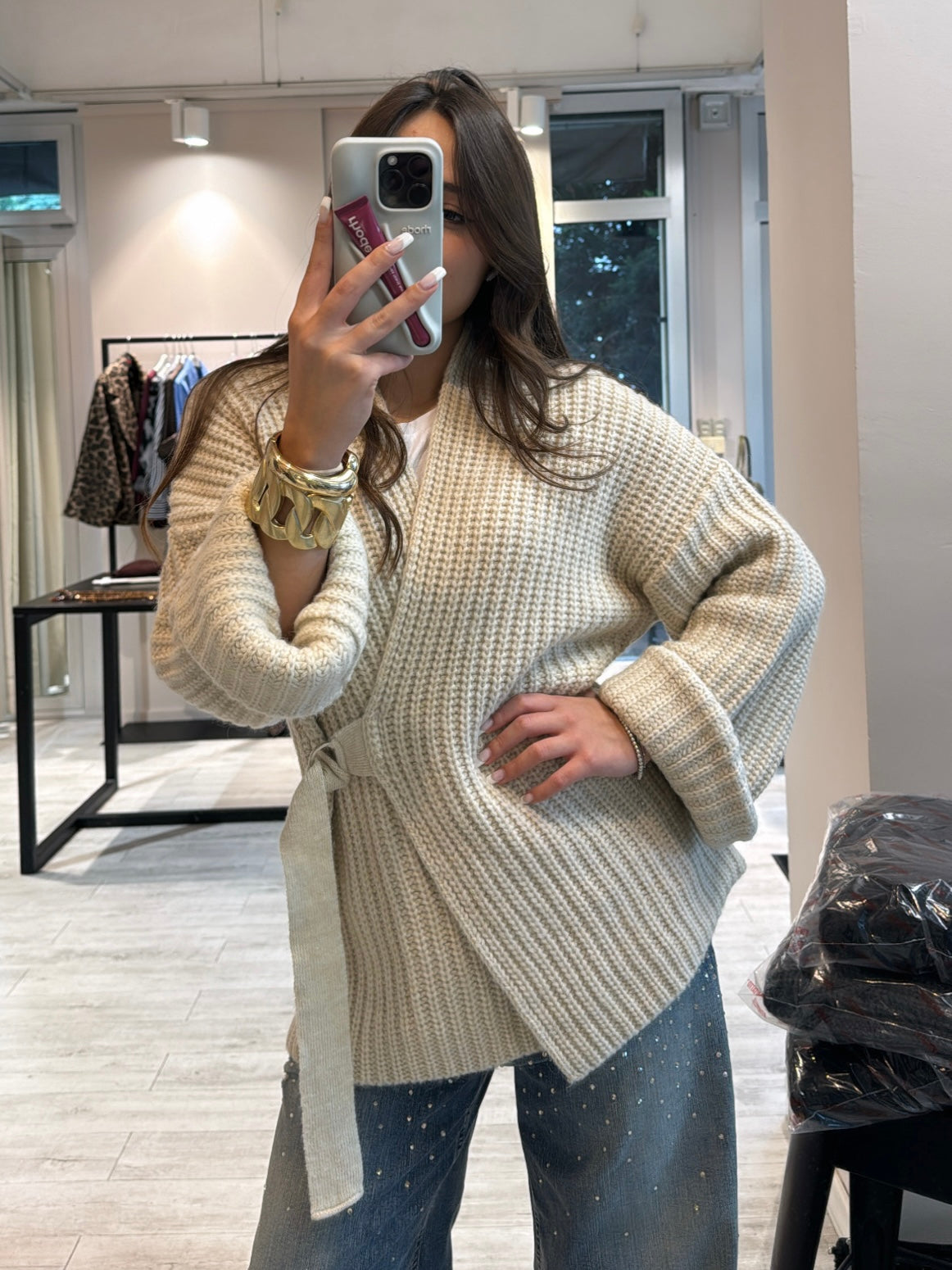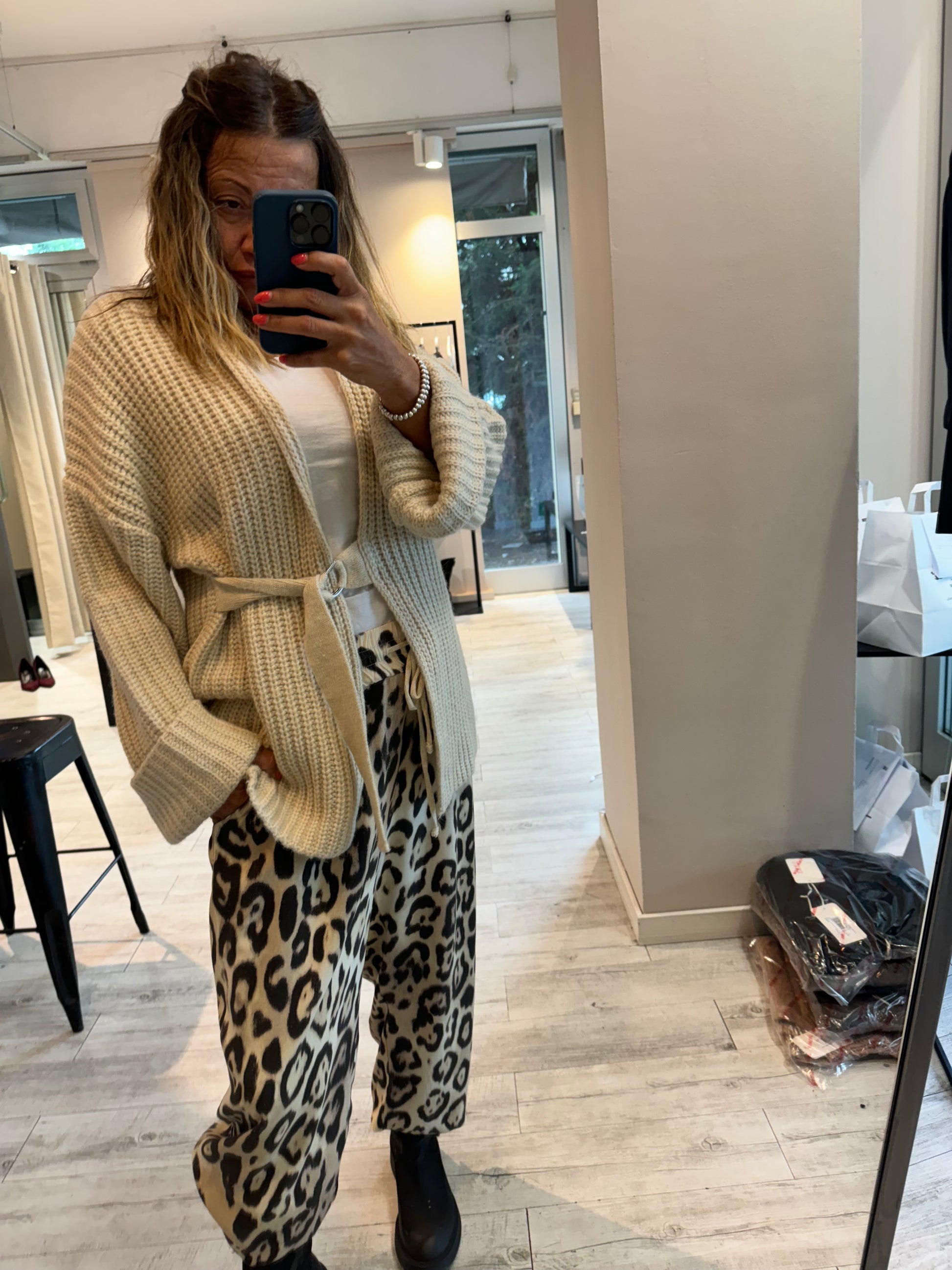 Un capo must-have per le mezze stagioni e le giornate più fresche: questo cardigan in maglia punto pannocchia combina linee minimal con un’eleganza rilassata. Il design avvolgente, unito alla cintura tono su tono che valorizza il punto vita, lo rende estremamente versatile e femminile.