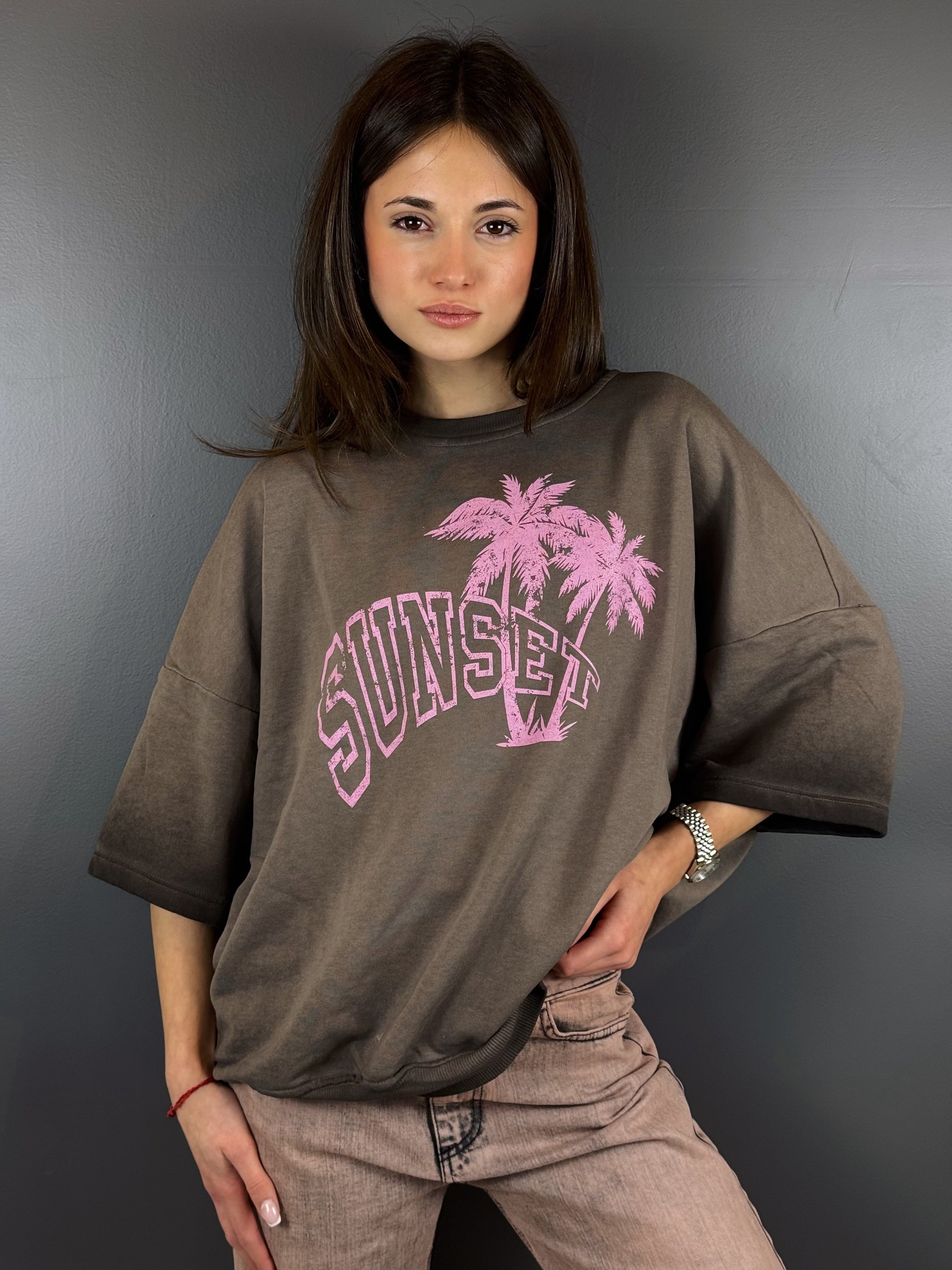 La tonalità marrone freddo/carbone sfumata mette in risalto la maxi grafica frontale in rosa pastello, creando un contrasto cromatico perfetto per la stagione.