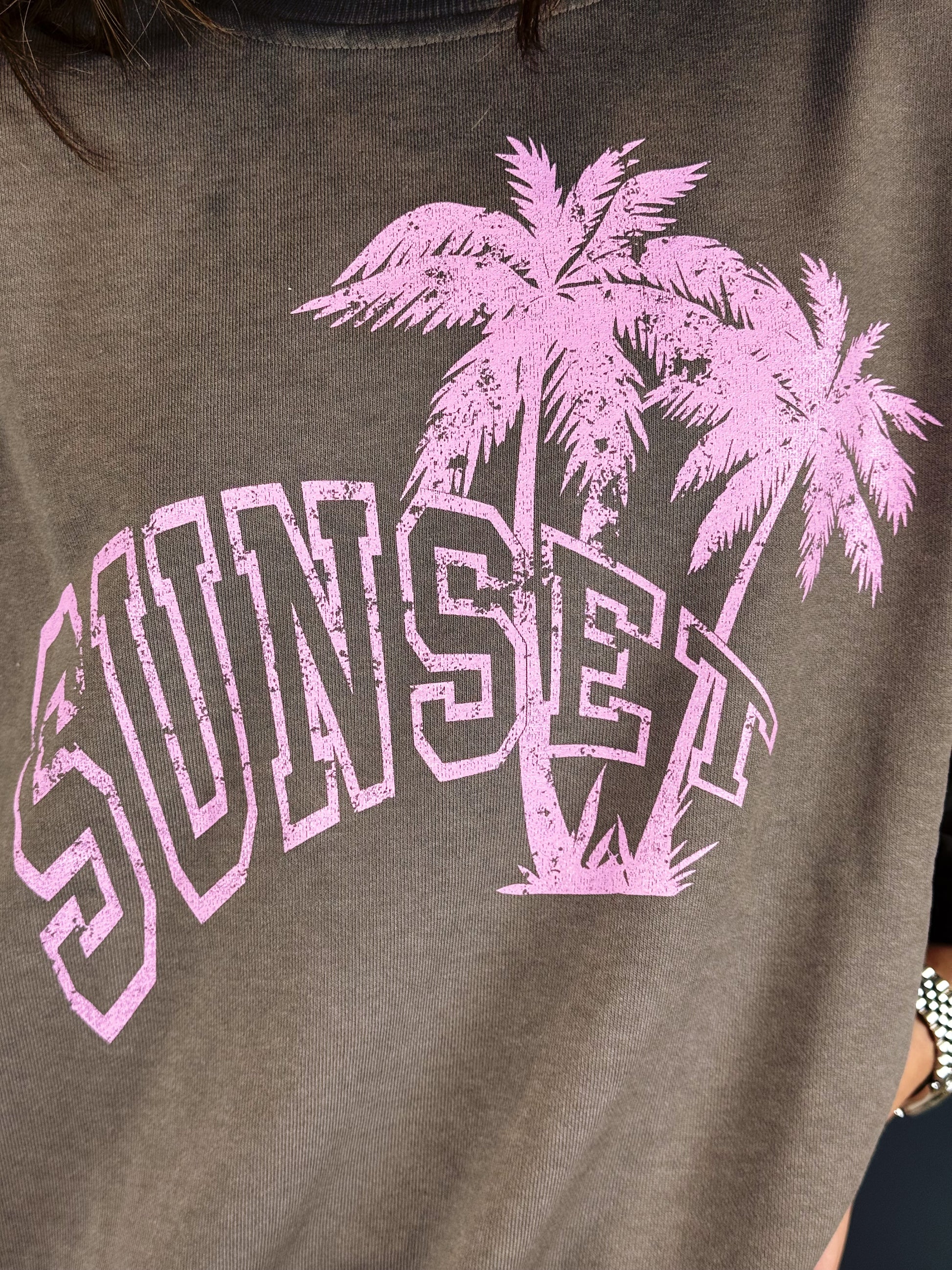 Grafica: Stampa frontale "SUNSET" con palme in stile college vintage, realizzata in rosa con effetto leggermente usurato.