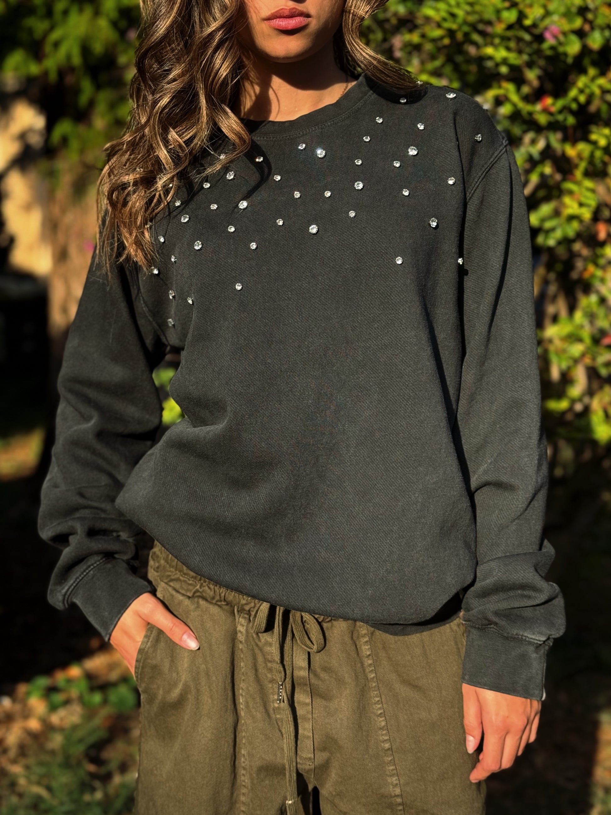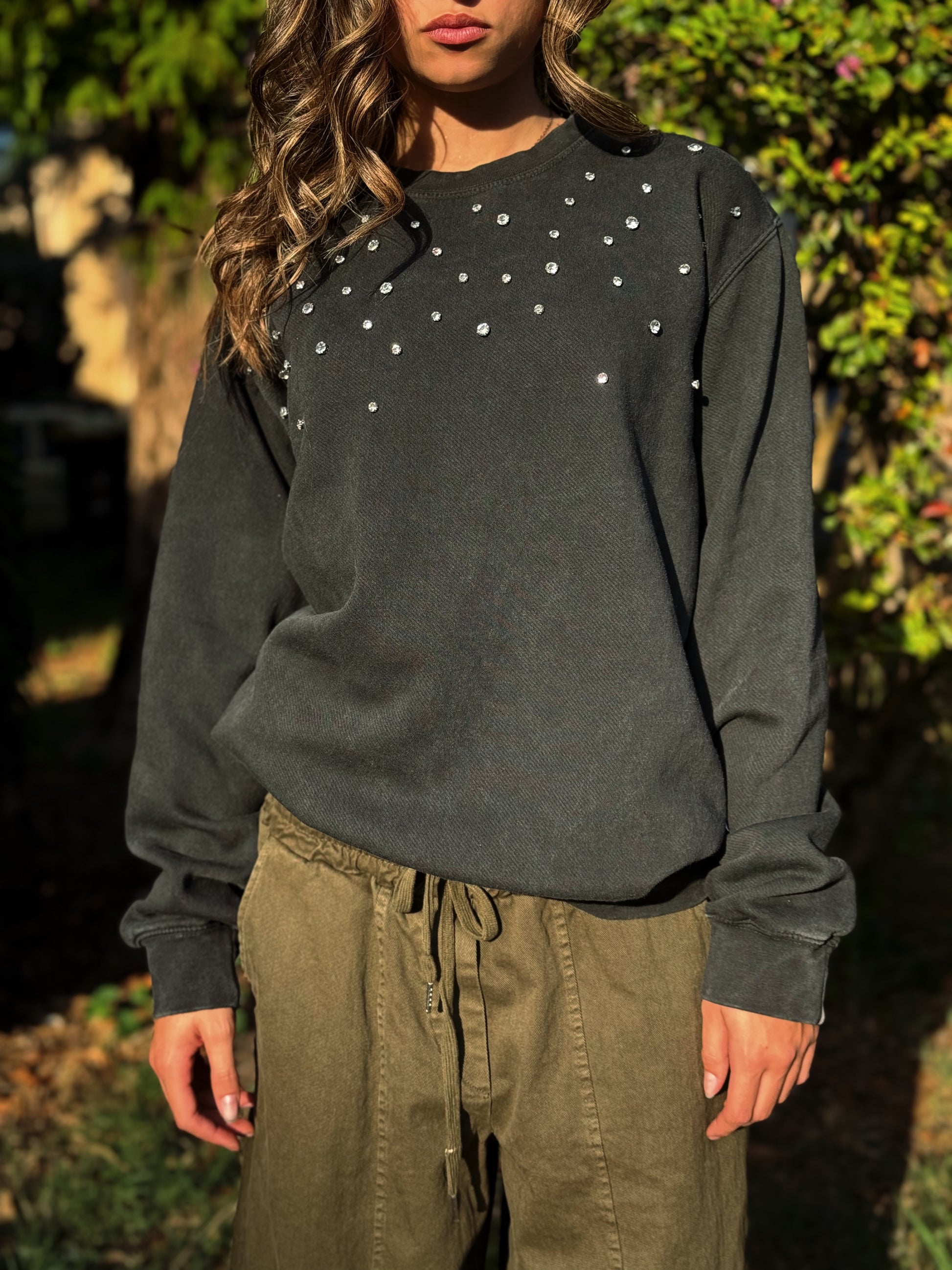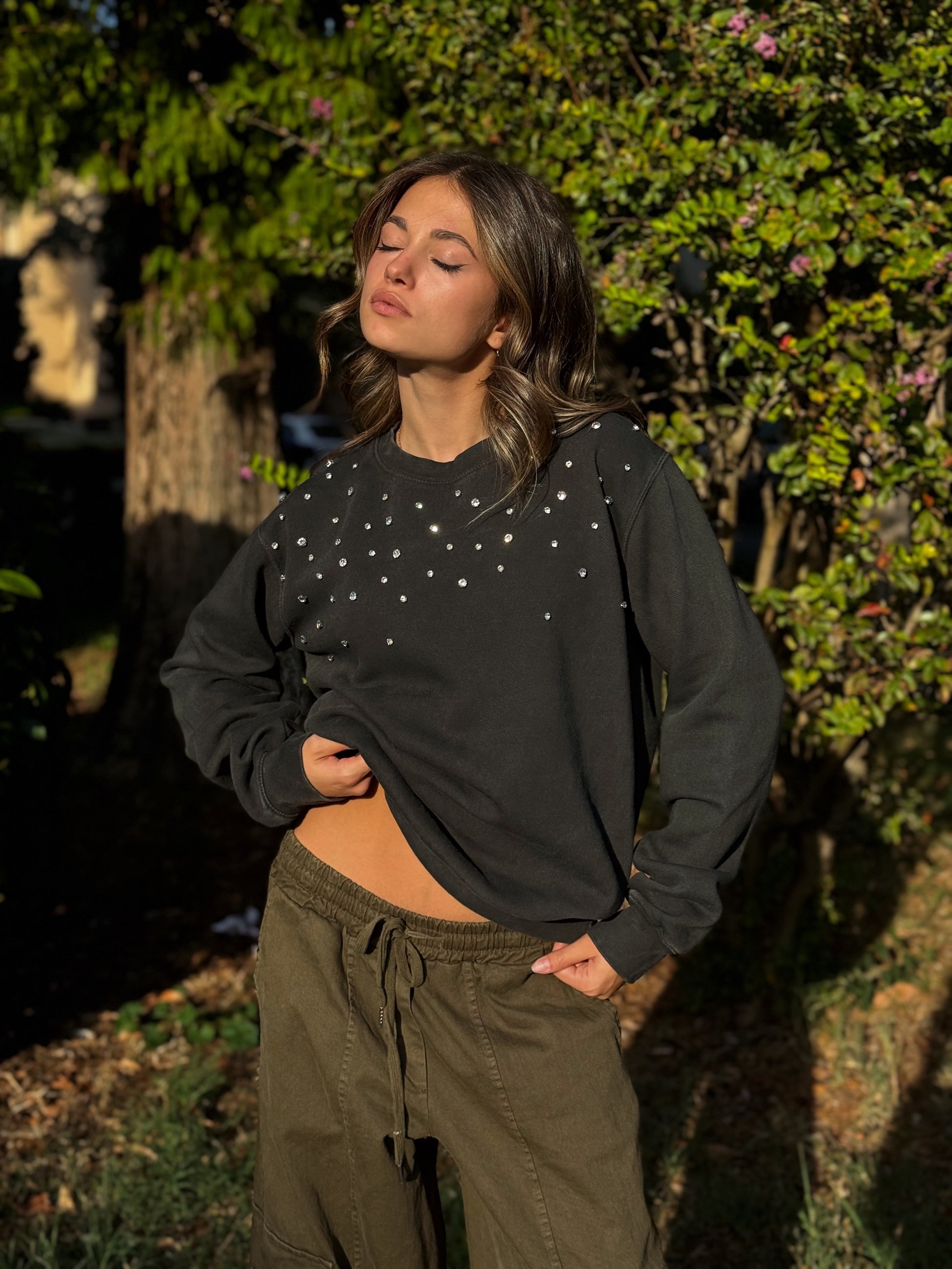 Tessuto in morbido cotone di colore grigio antracite, strass applicati sul petto.