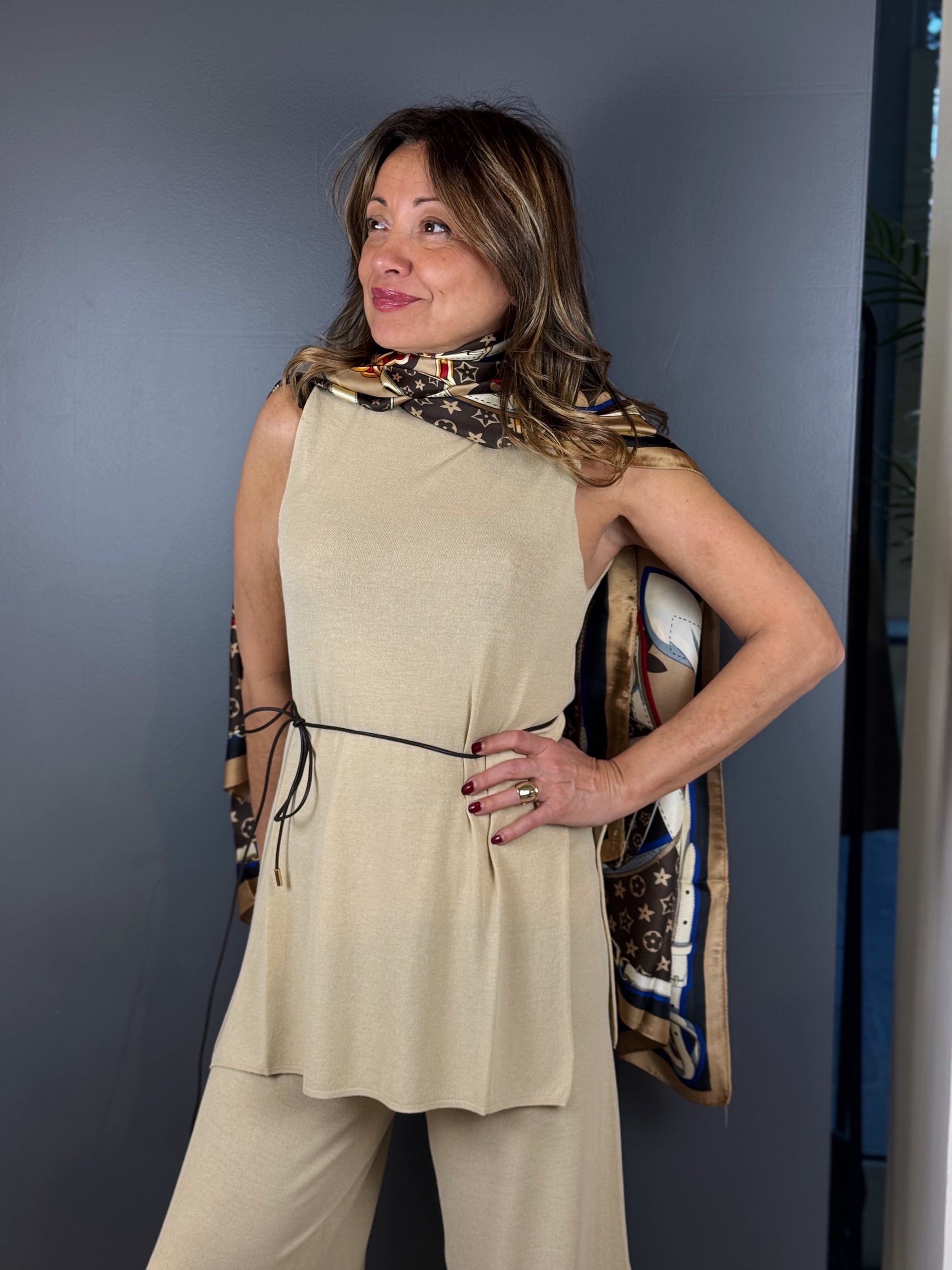 • Versatilità: Lo scollo rotondo e il taglio smanicato permettono di indossarlo da solo come top o sopra una maglia sottile.