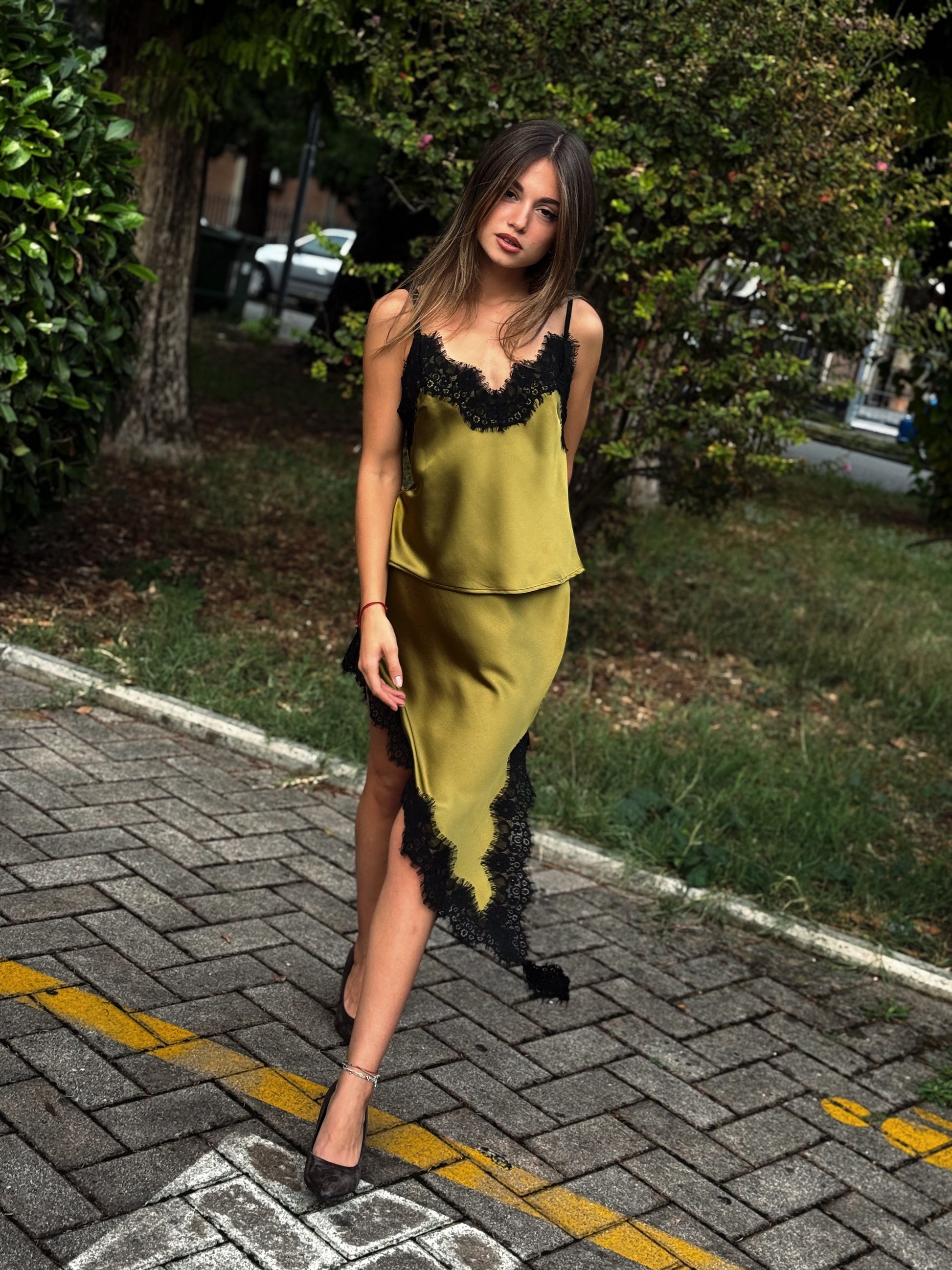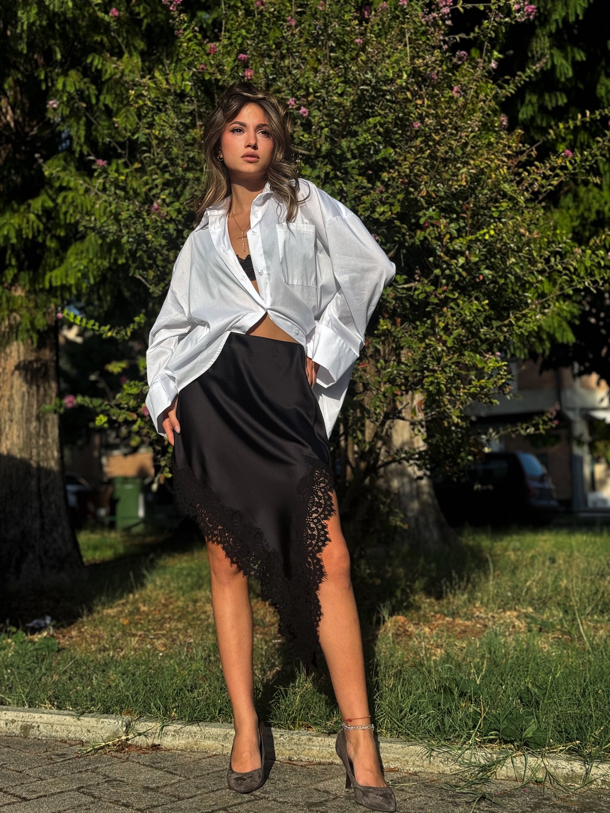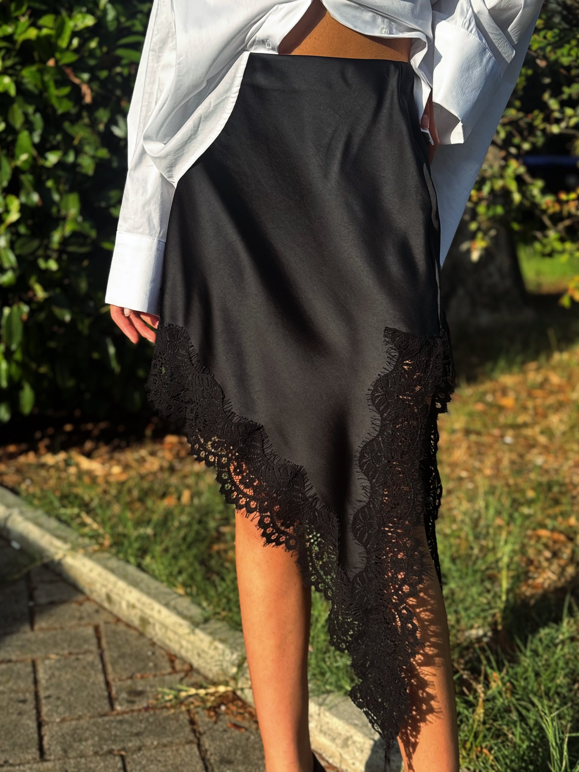 Questa gonna in satin è un capo d'abbigliamento che ti farà sentire elegante e seducente in ogni occasione speciale. La sua silhouette asimmetrica, con un orlo che scende più in basso su un lato, crea un movimento fluido e affascinante.