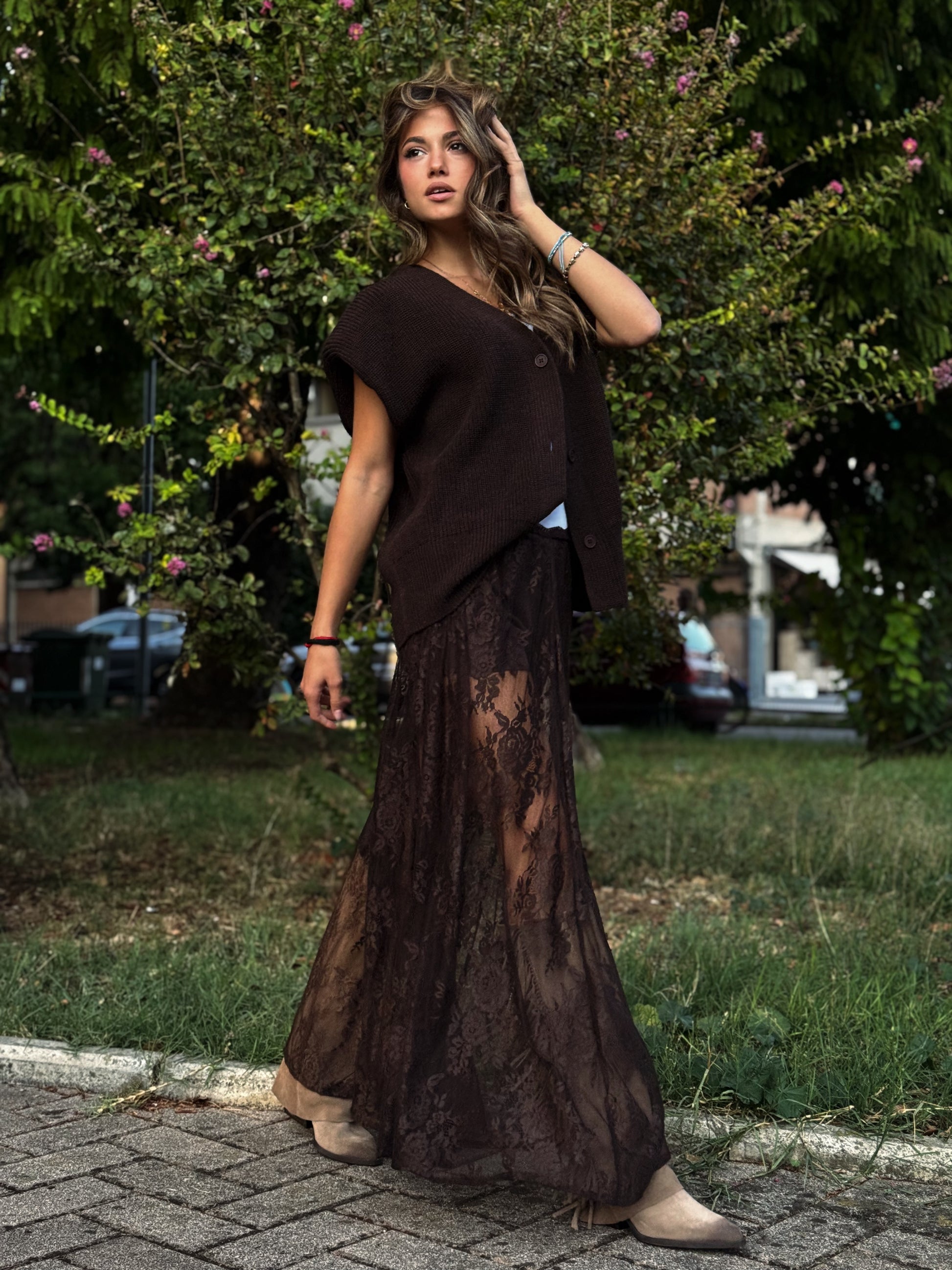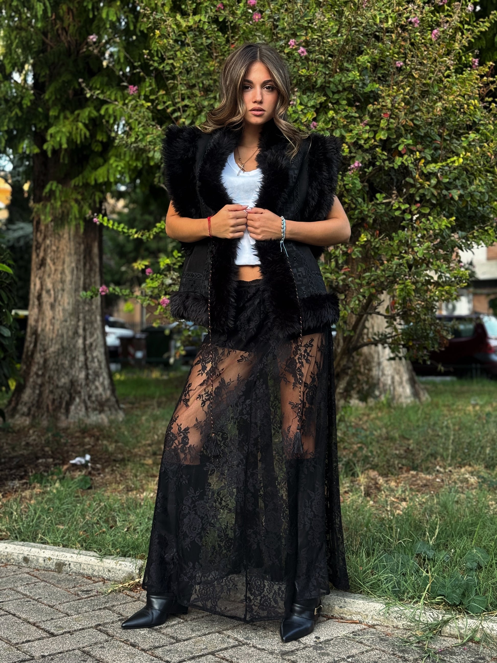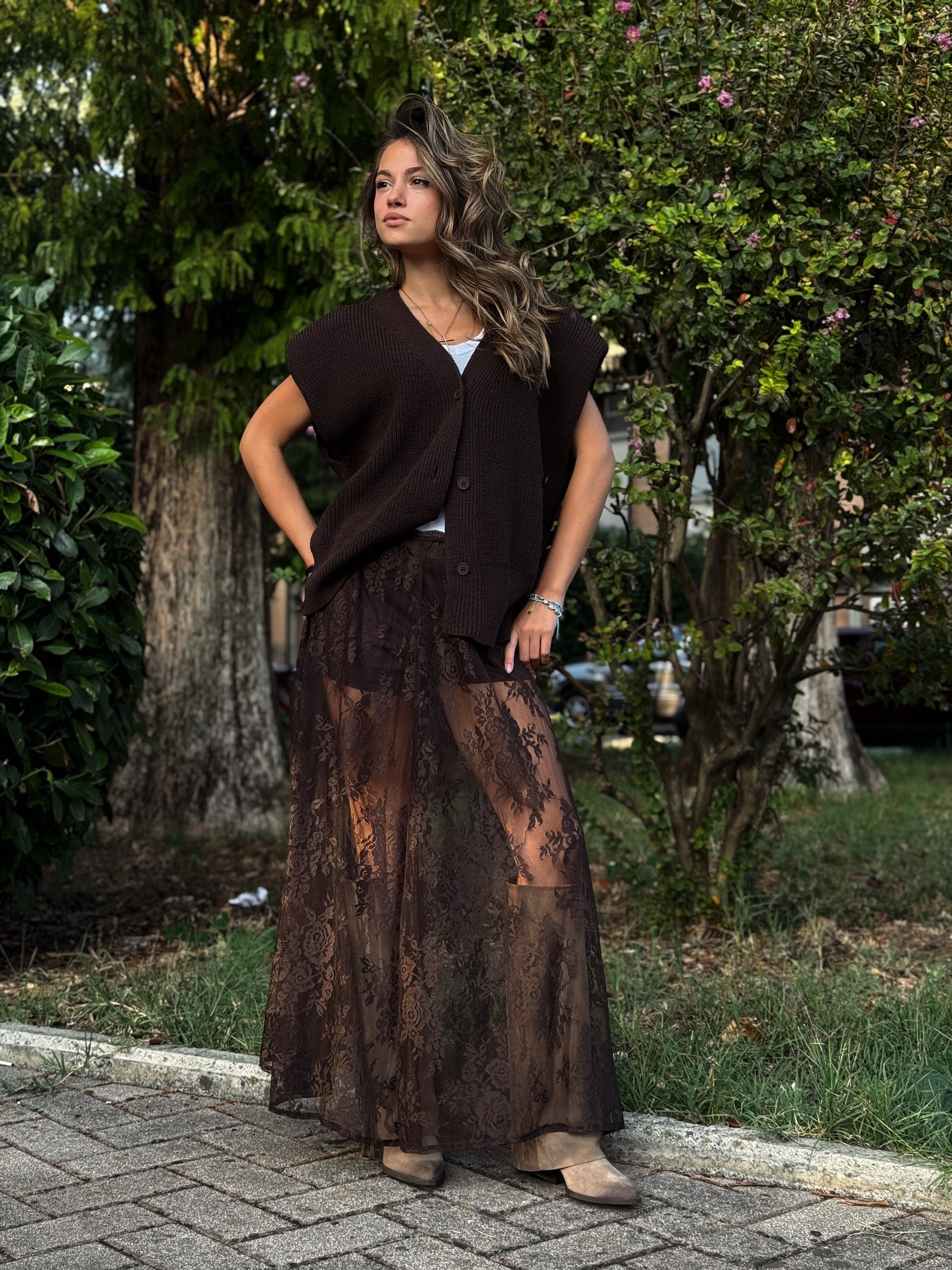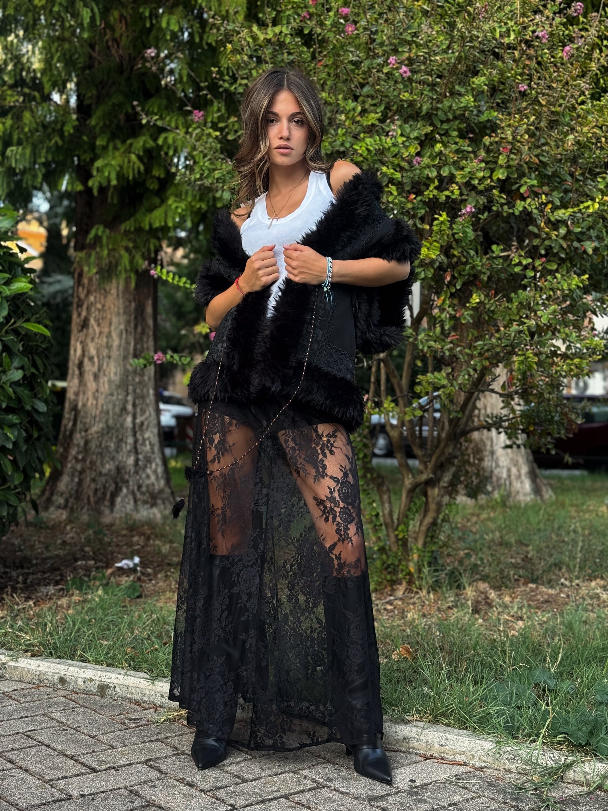 Questa gonna in pizzo è un capo d'abbigliamento che unisce romanticismo e audacia, perfetta per le donne che amano uno stile unico e femminile.
