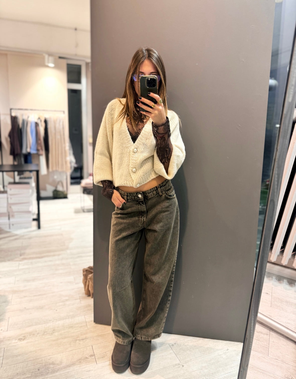 - Taglio e vestibilità: gamba larga e dritta per un fit rilassato che slancia la silhouette e garantisce libertà di movimento. Pences sul ginocchio che valorizzano la sua linea.