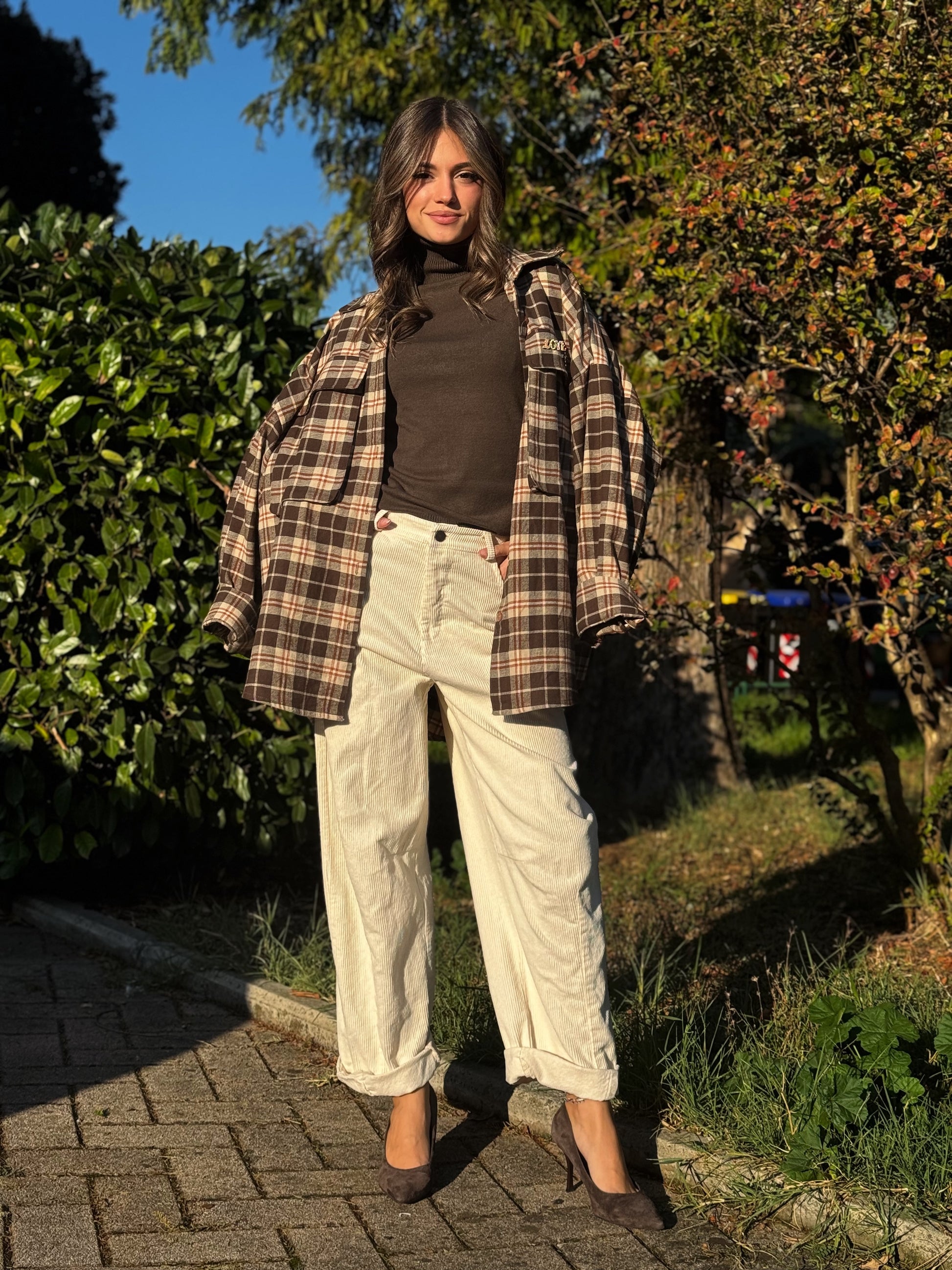 Pantalone modello baloon, con una leggera bombatura sulla gamba verso l’esterno. È un tessuto tipo velluto, quindi è comodo, caldo e confortevole!