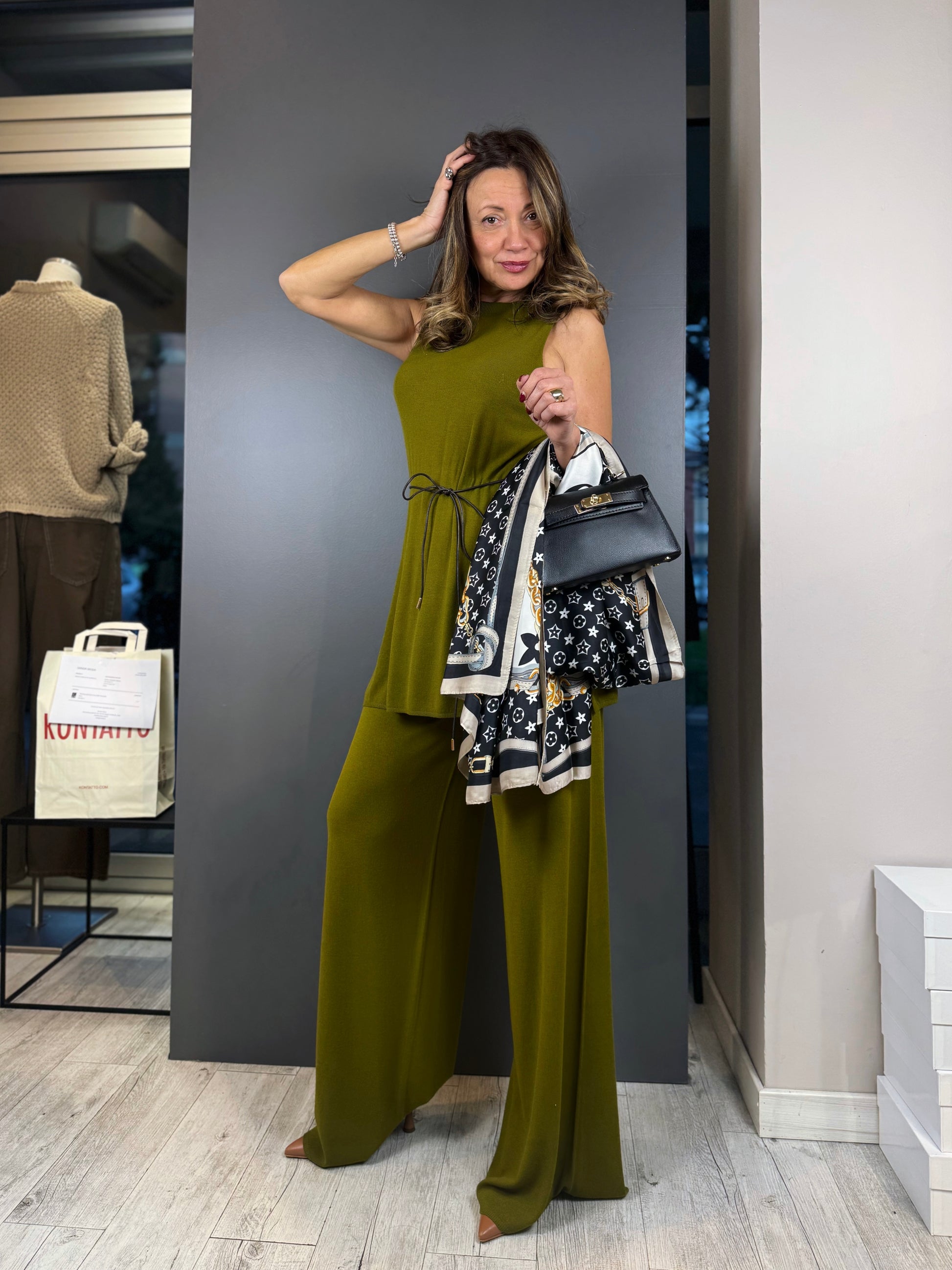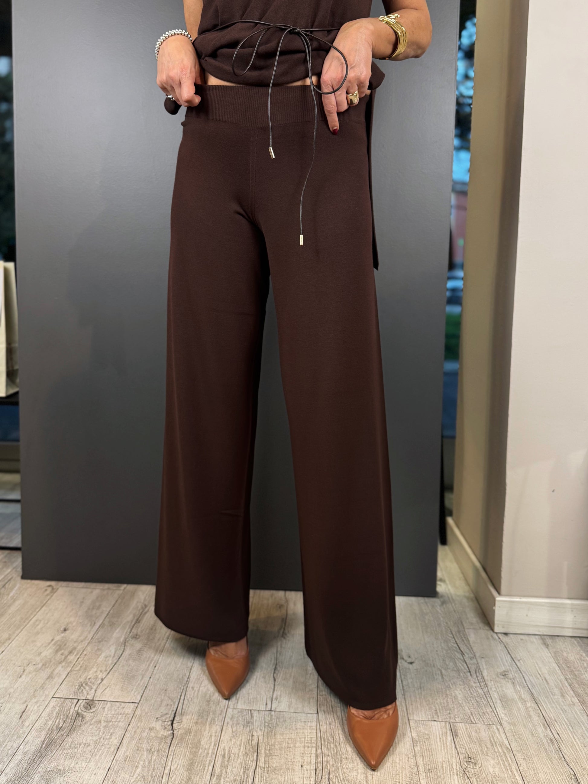 • Silhouette: Il taglio a gamba larga (palazzo) scivola morbidamente lungo i fianchi, creando un movimento fluido e slanciando naturalmente la figura.