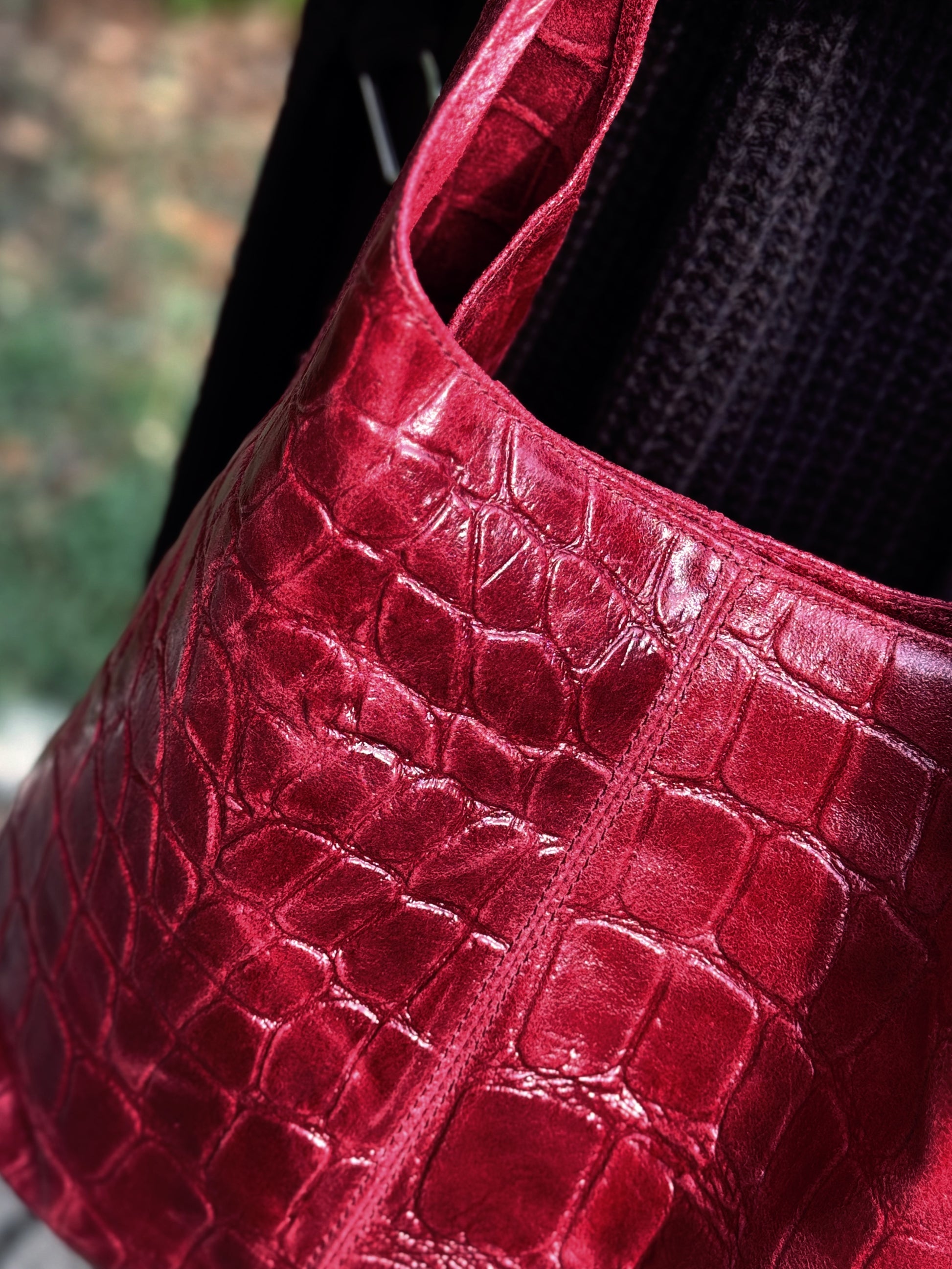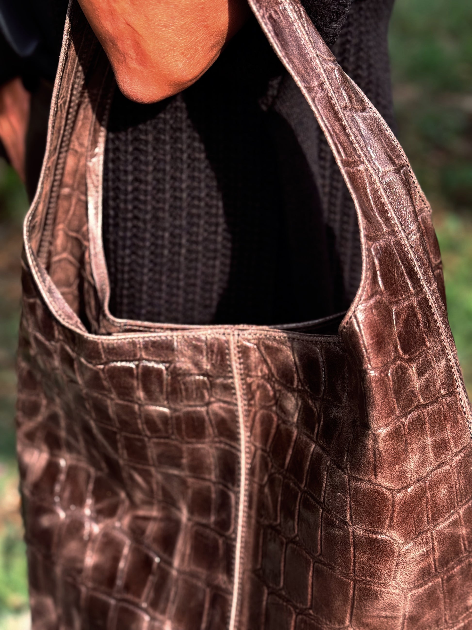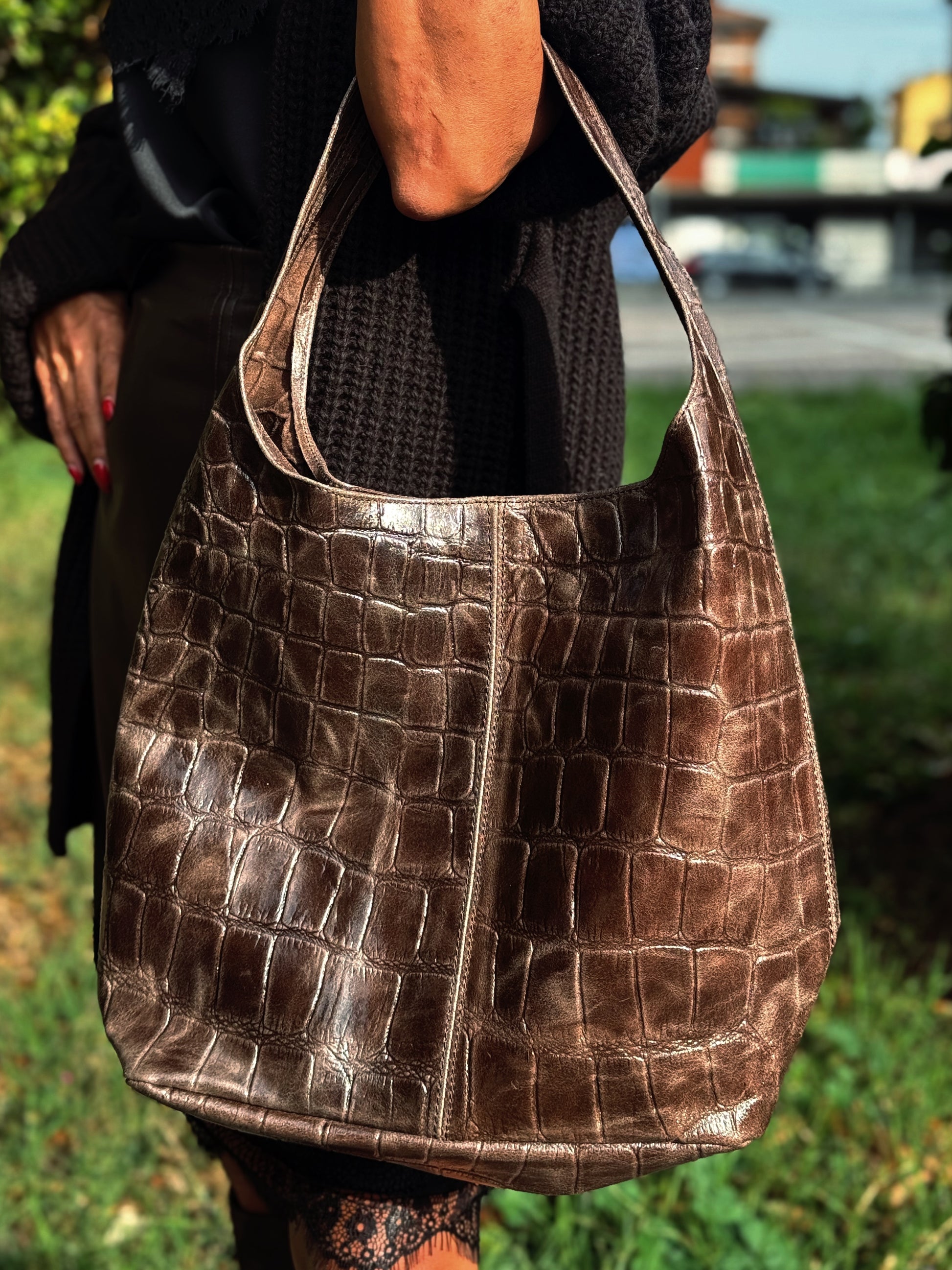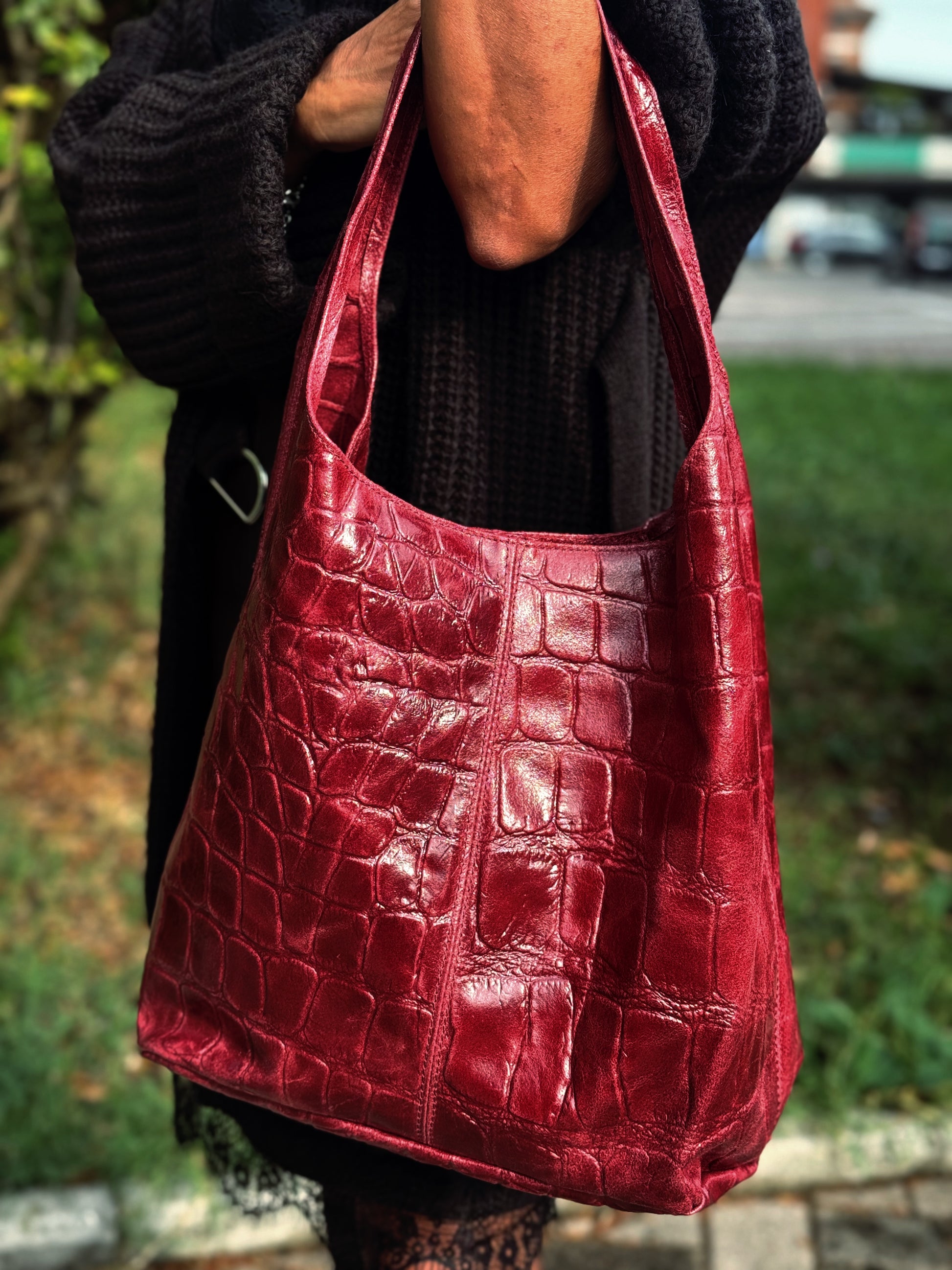 Borsa modello sacca, con una fantastica texture coccodrillo. Disponibile nei colori moro e bordeaux.