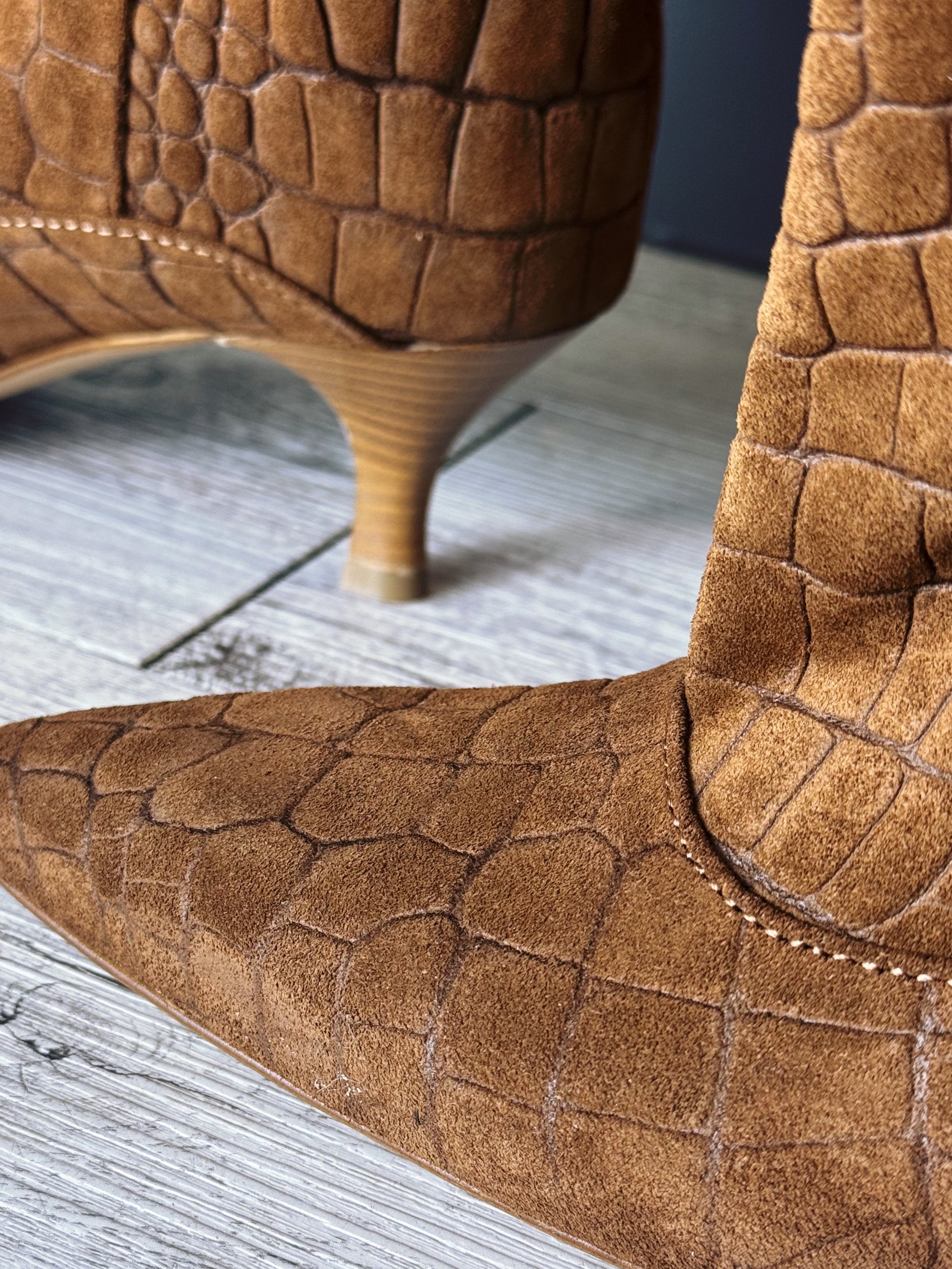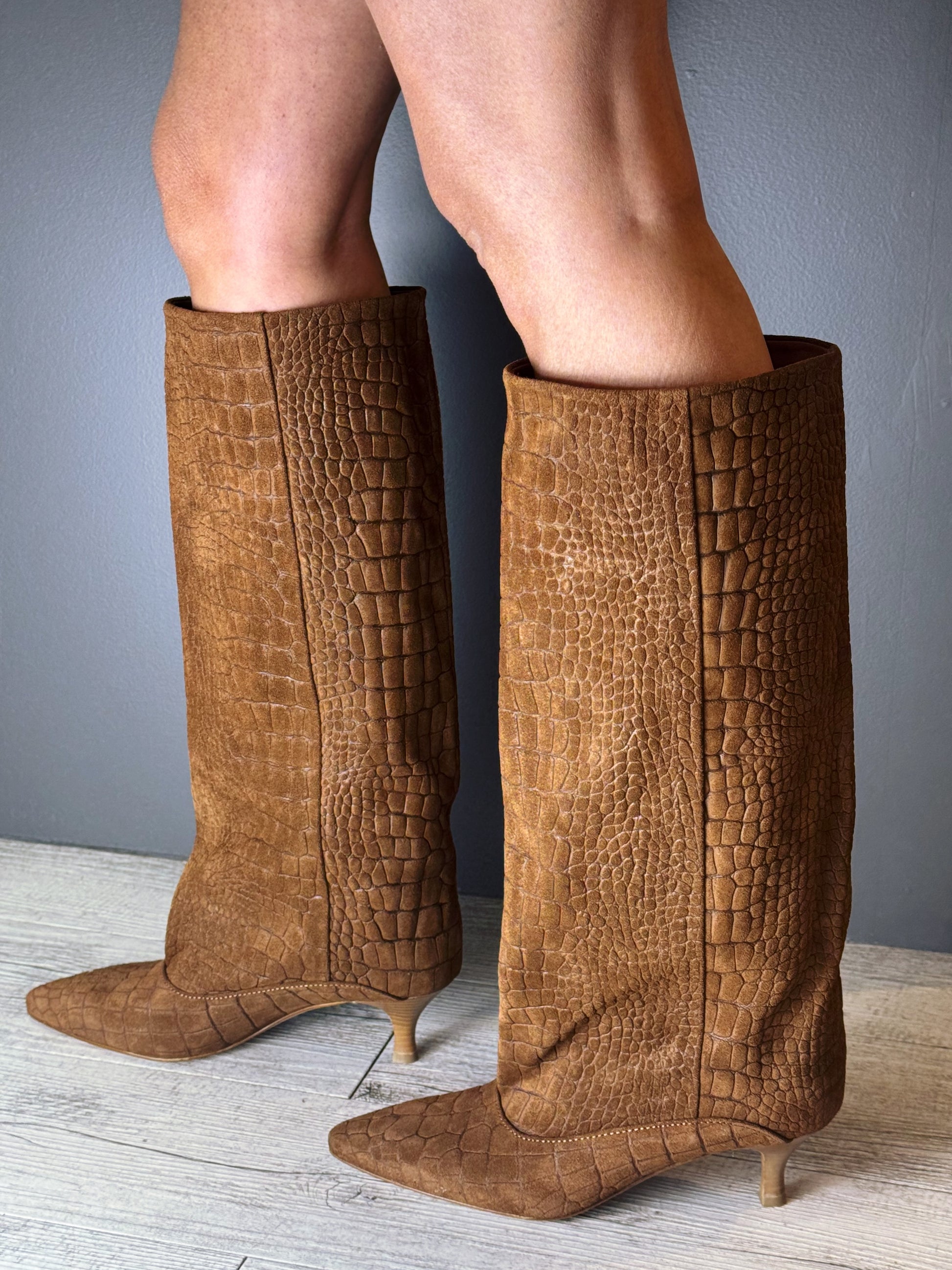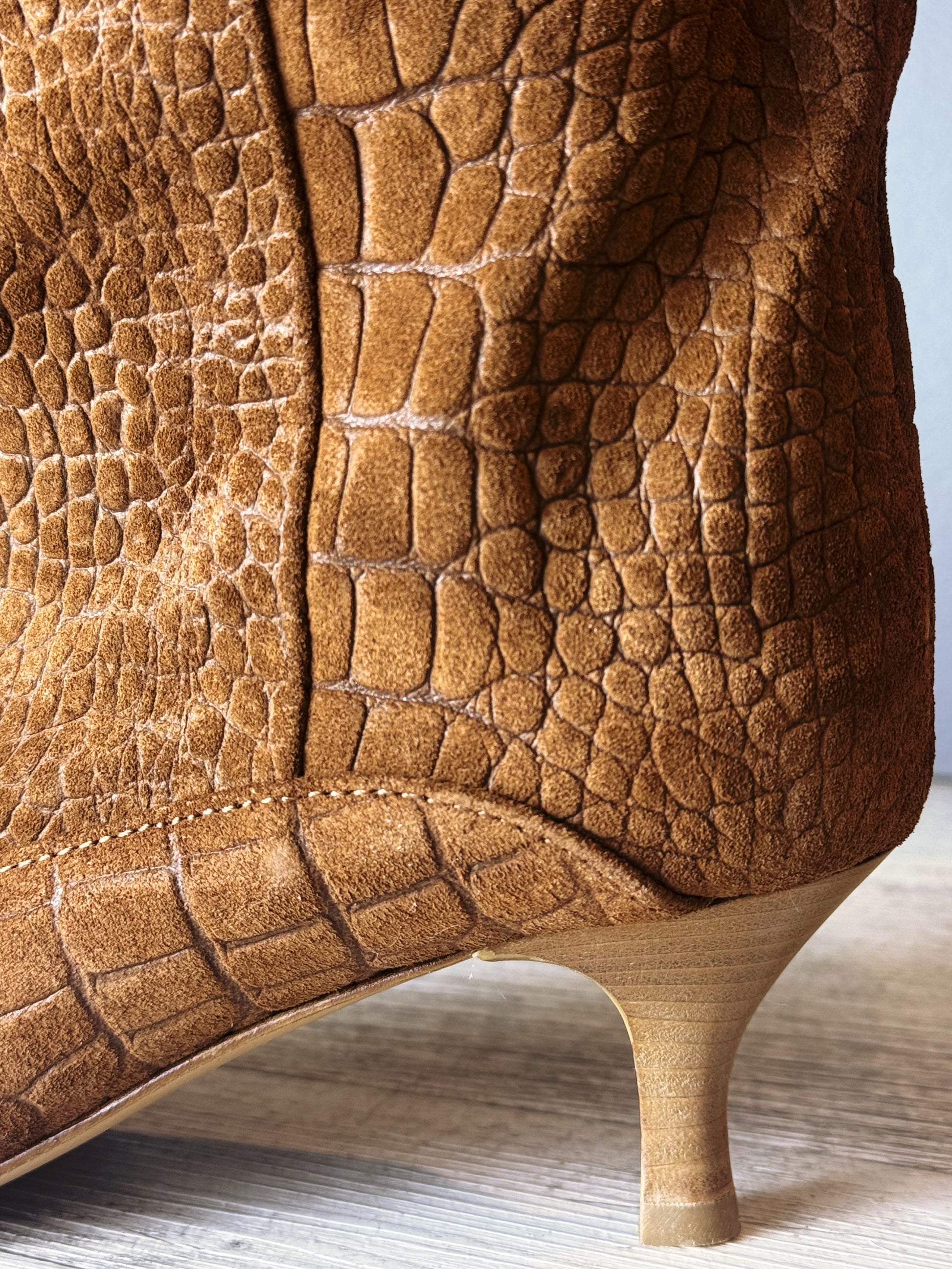 Texture cocco: Realizzato in morbido suede marrone caramello con una sofisticata stampa a rilievo effetto coccodrillo che dona profondità e carattere alla calzatura.