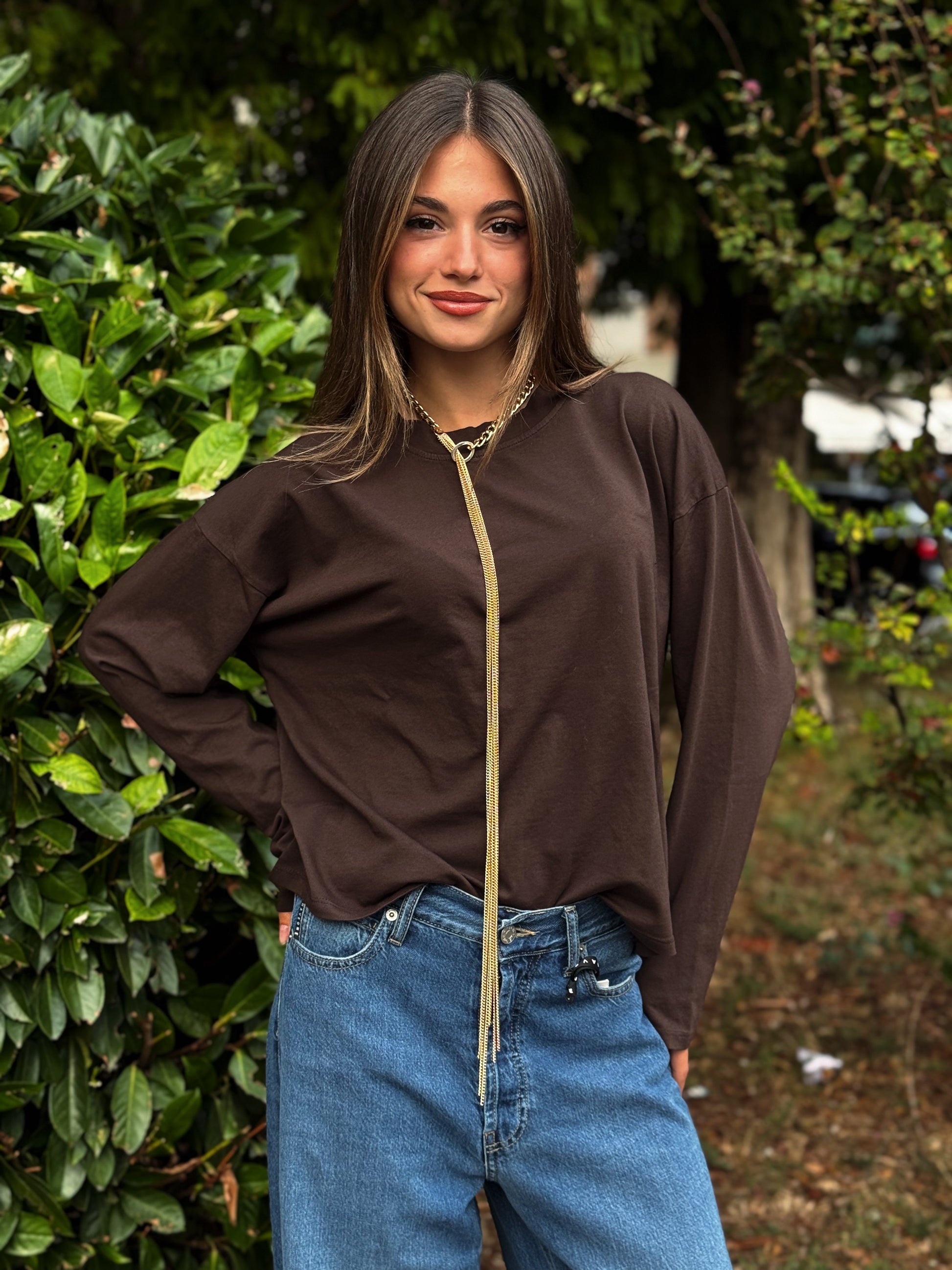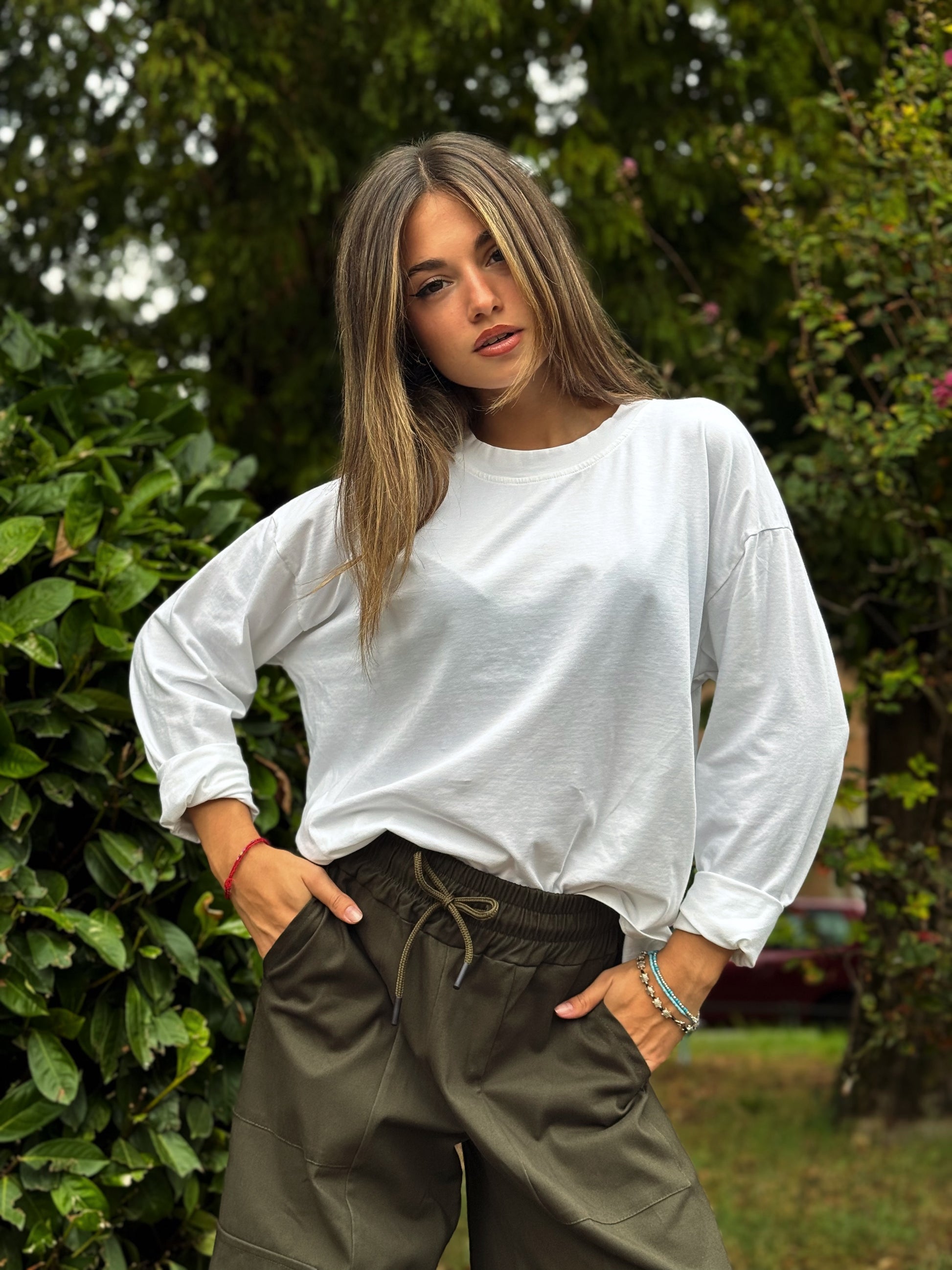 T-shirt a maniche lunghe dal taglio casual e versatile, perfetta per ogni occasione. Realizzata in tessuto morbido e leggero, garantisce comfort e libertà di movimento. Il design semplice con girocollo e vestibilità rilassata la rende un capo essenziale da abbinare facilmente a qualsiasi outfit. Disponibile nei colori: moro, vino e bianco.
