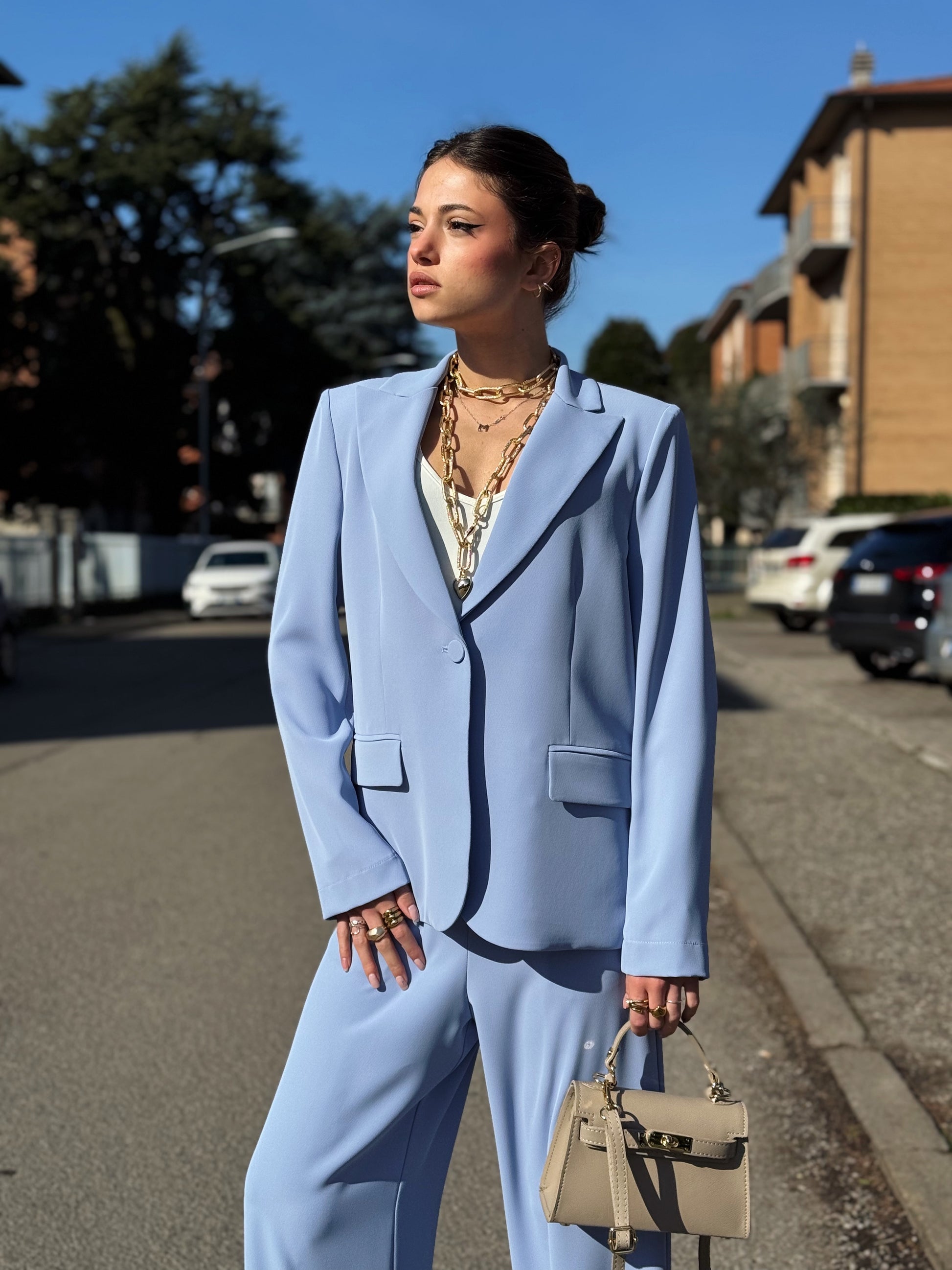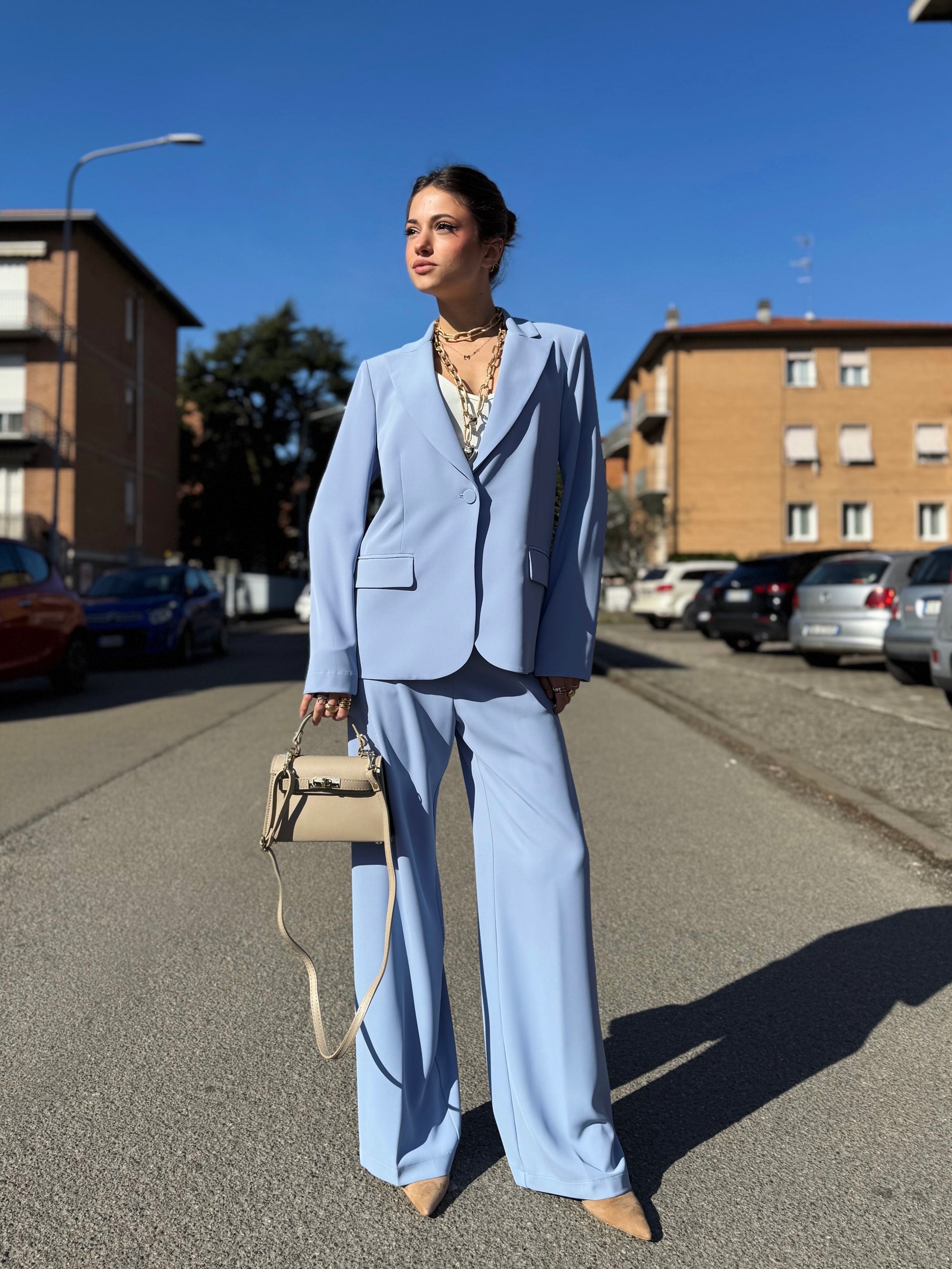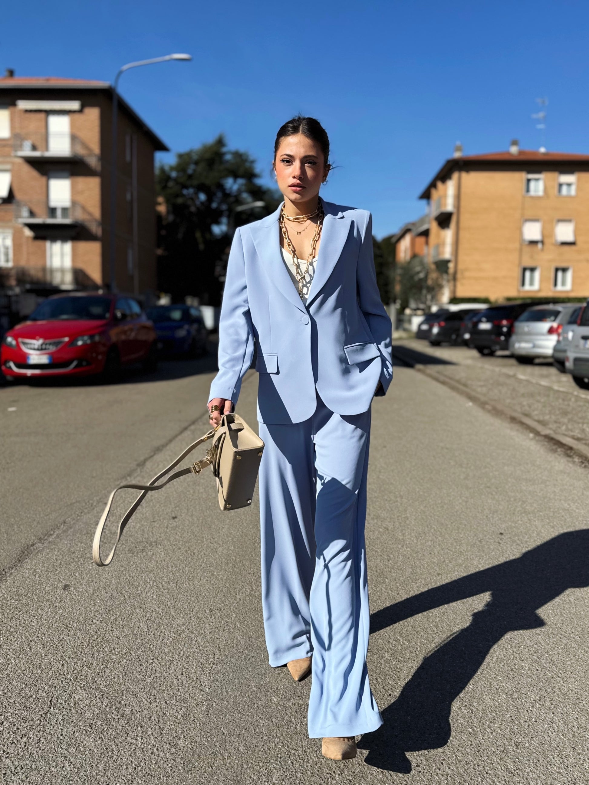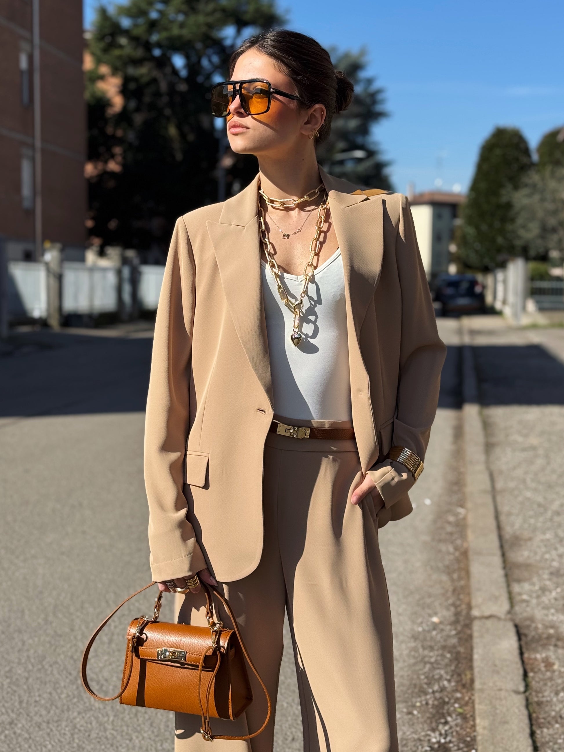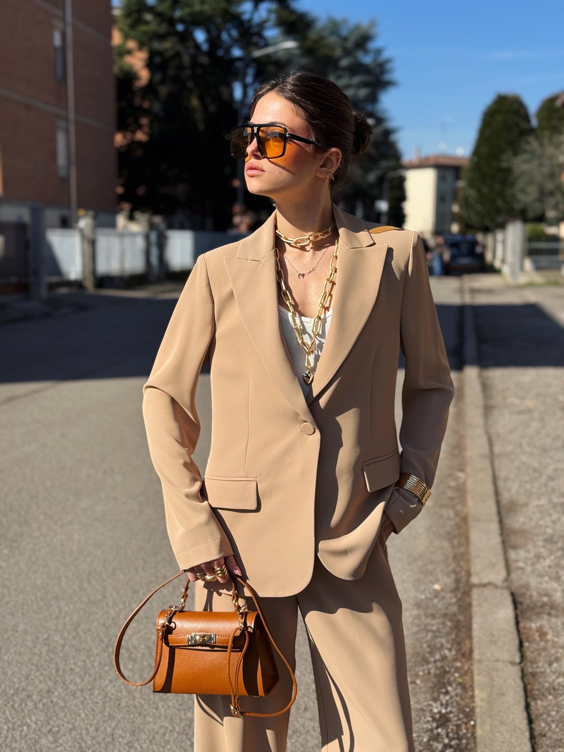 Progettato per una donna dinamica che non vuole scegliere tra professionalità e femminilità, questo completo si distingue per il suo taglio impeccabile e la qualità dei tessuti che accarezzano la silhouette senza costringerla.