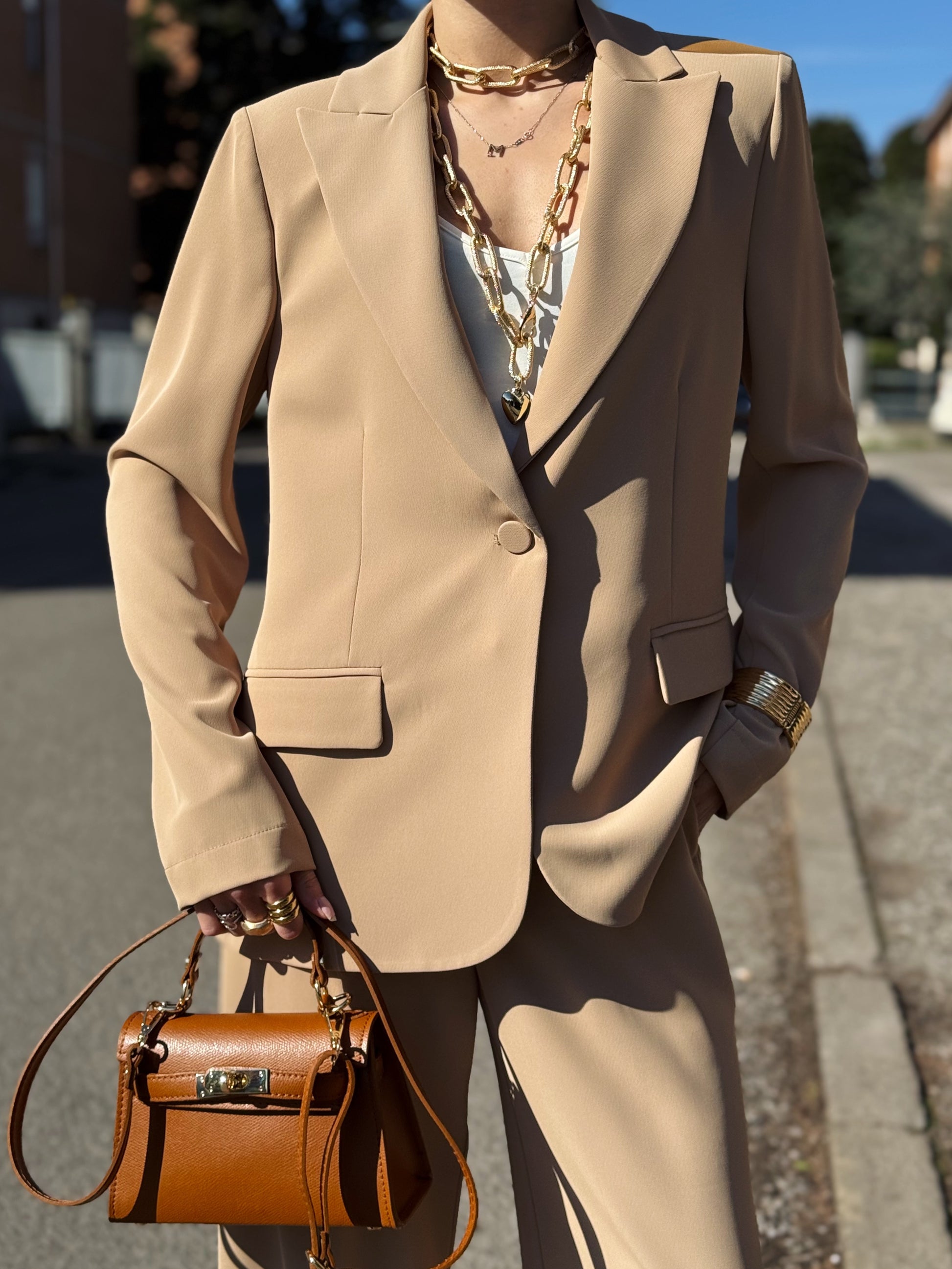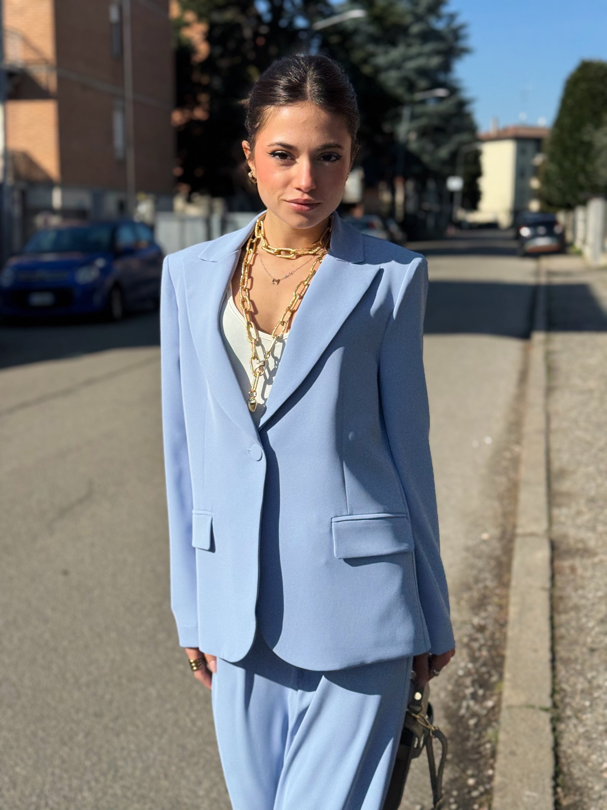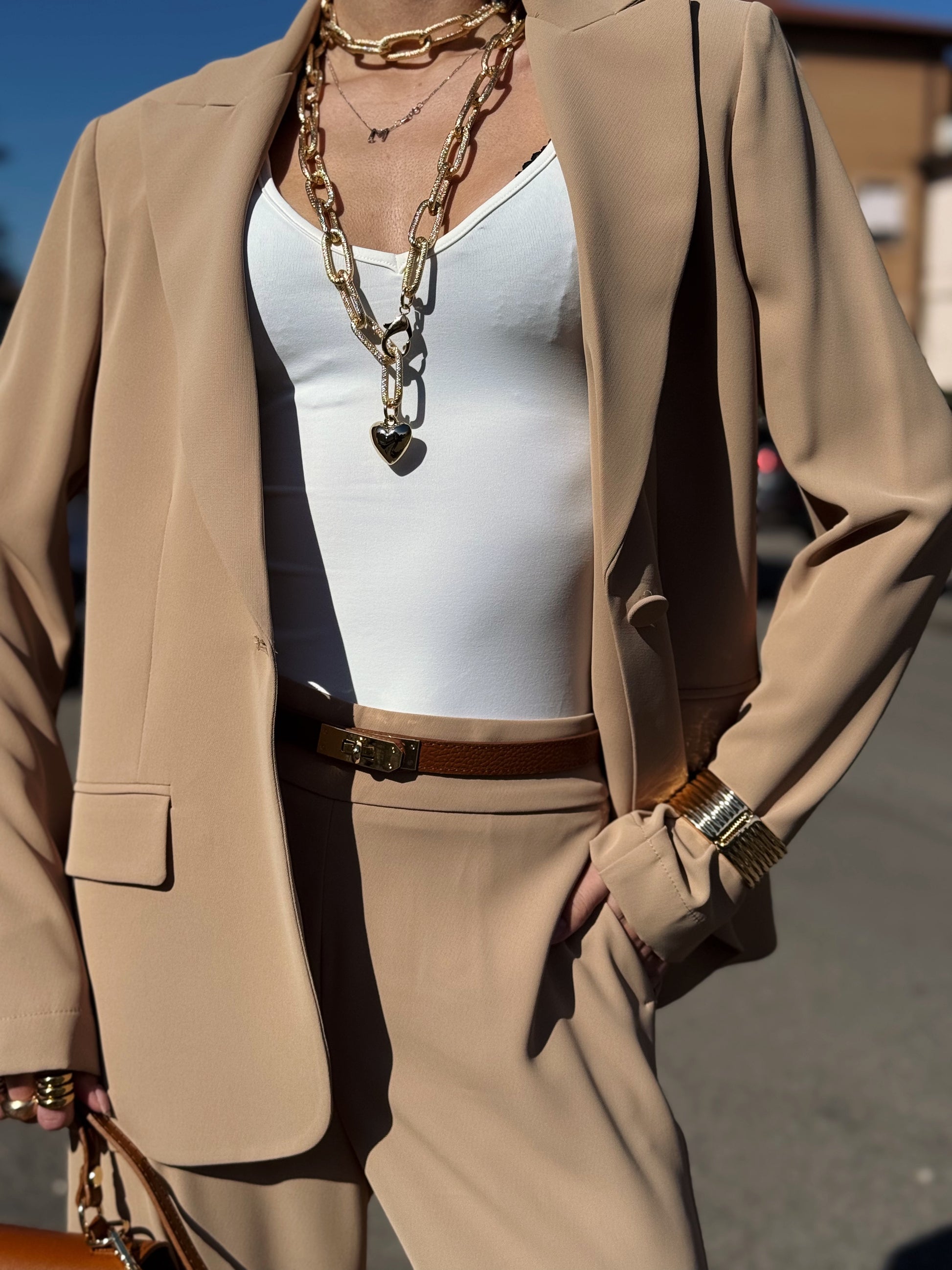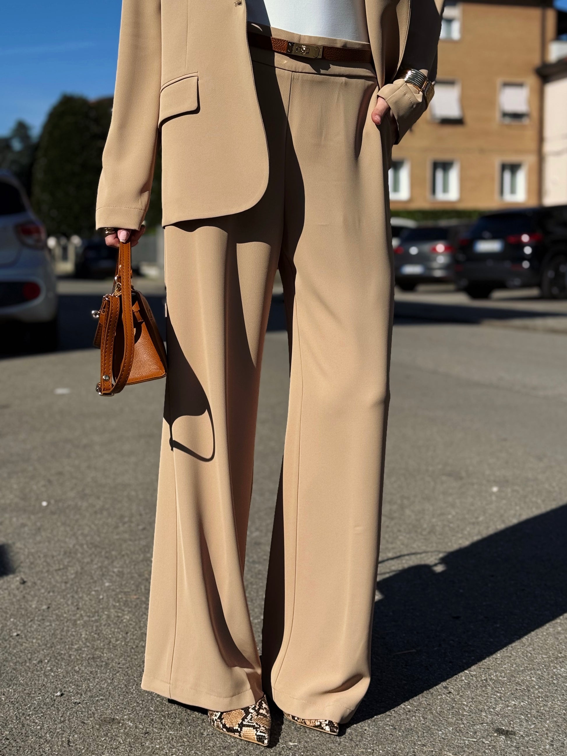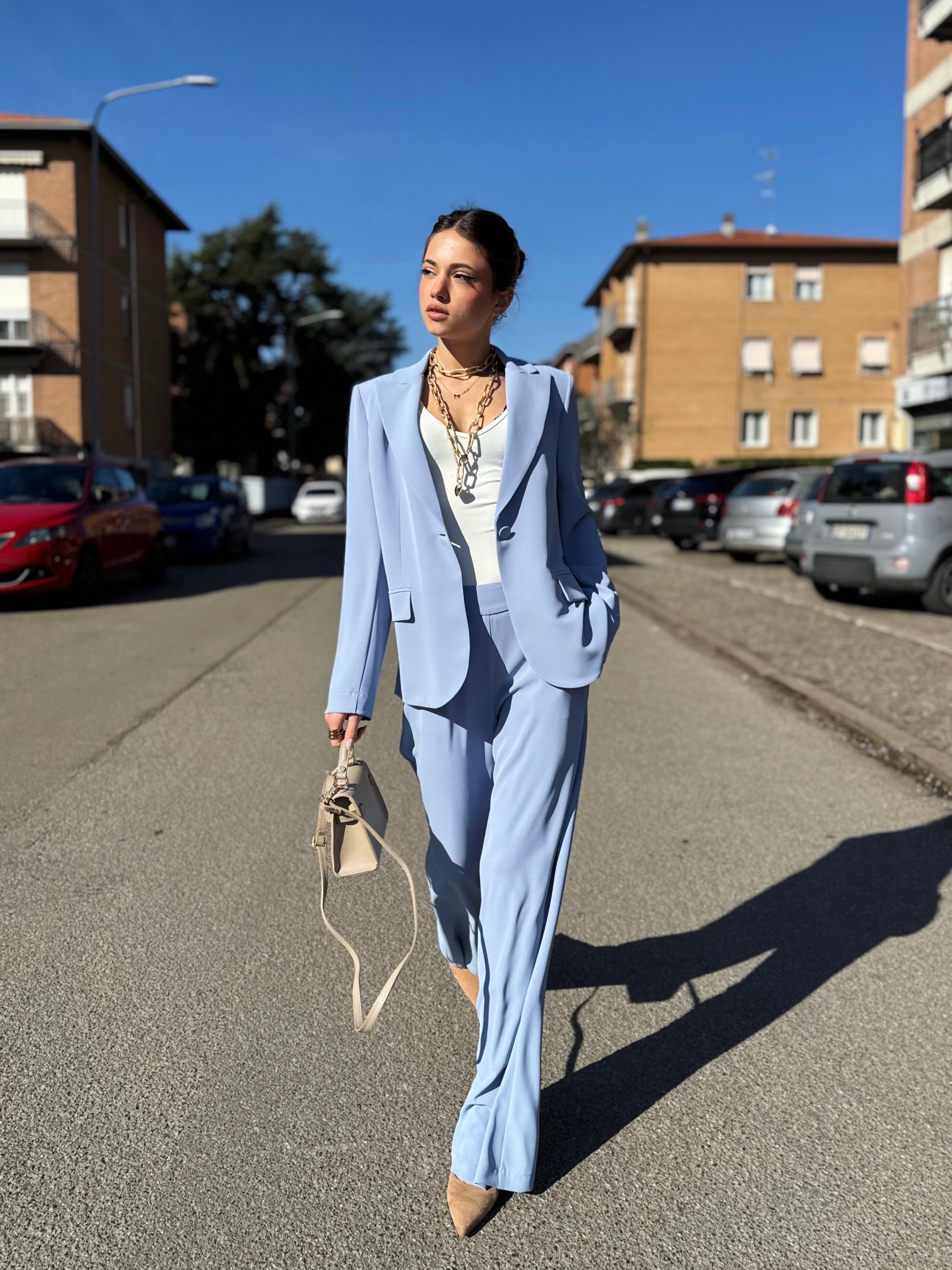 Progettato per una donna dinamica che non vuole scegliere tra professionalità e femminilità, questo completo si distingue per il suo taglio impeccabile e la qualità dei tessuti che accarezzano la silhouette senza costringerla.